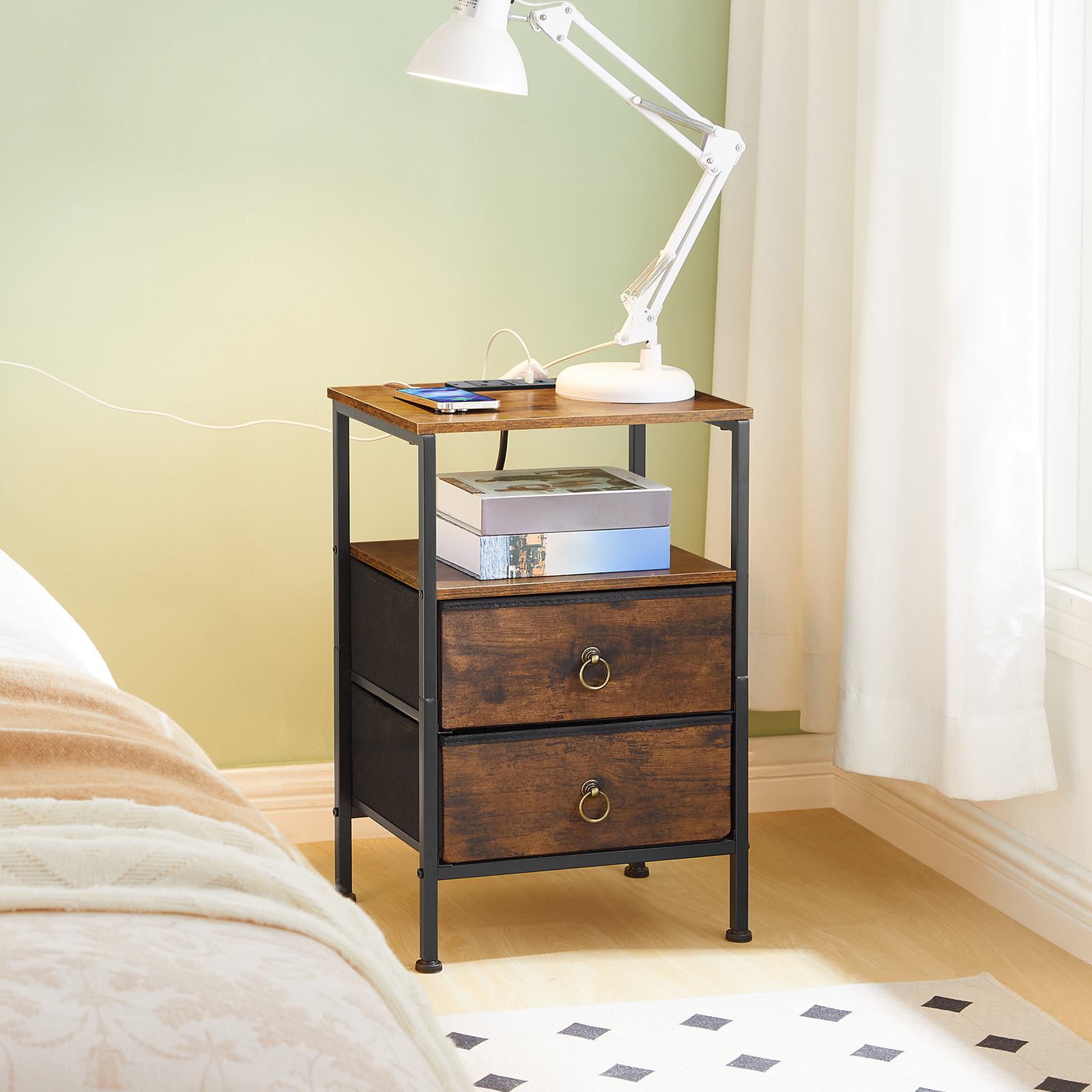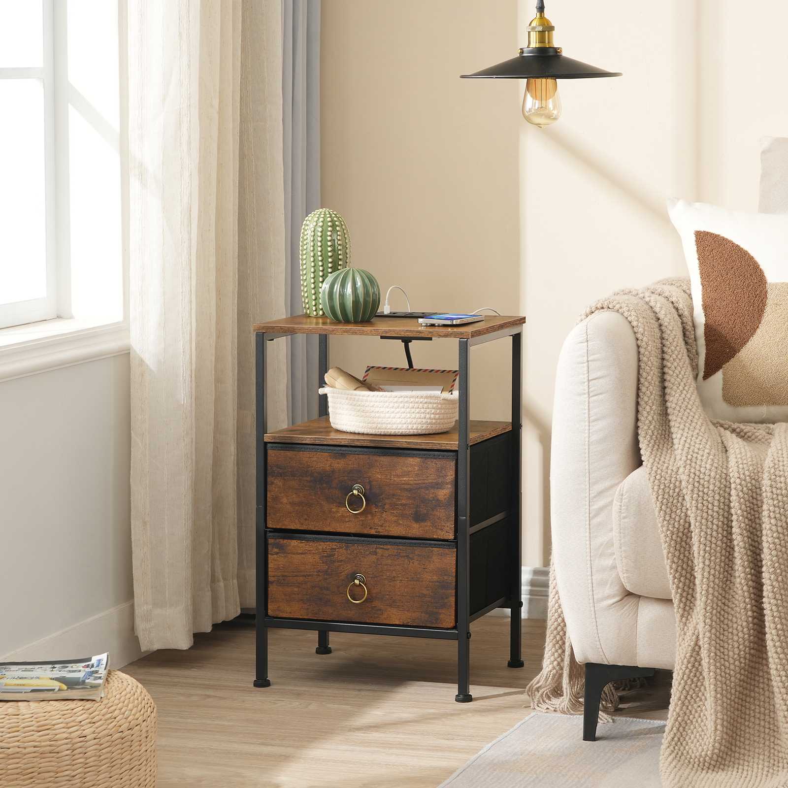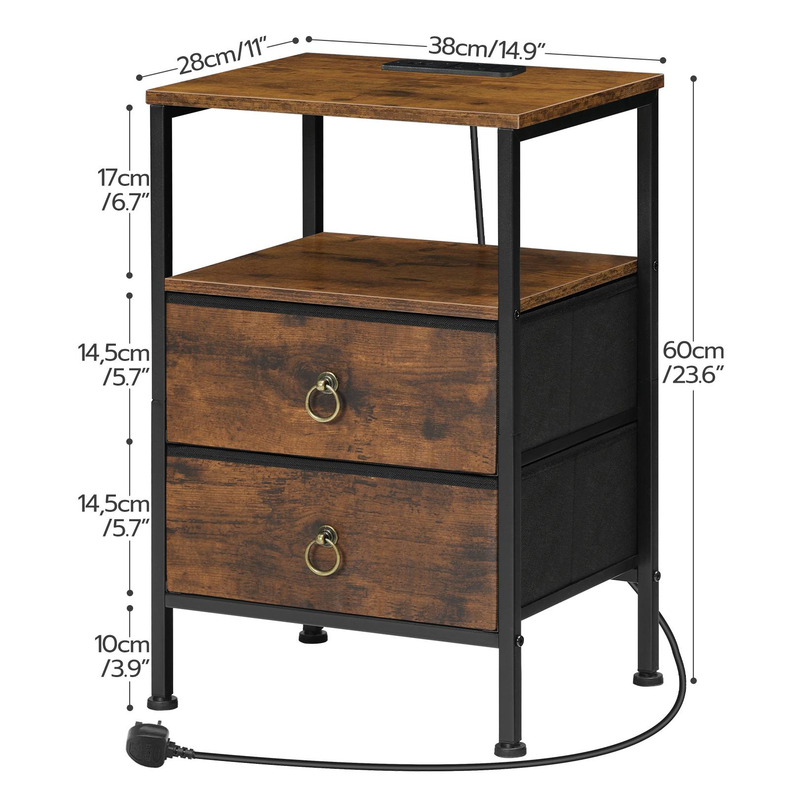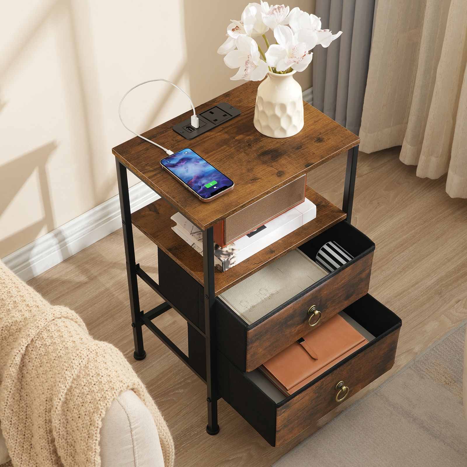 Tavolino con stazione di ricarica, Comodino Comodino Dotato di 2 Porte USB & 1 Presa di corrente, Tavolino con 2 Cassetti in tessuto, Tavolo portaoggetti multifunzionale per piccoli spazi, Marrone rustico & Nero