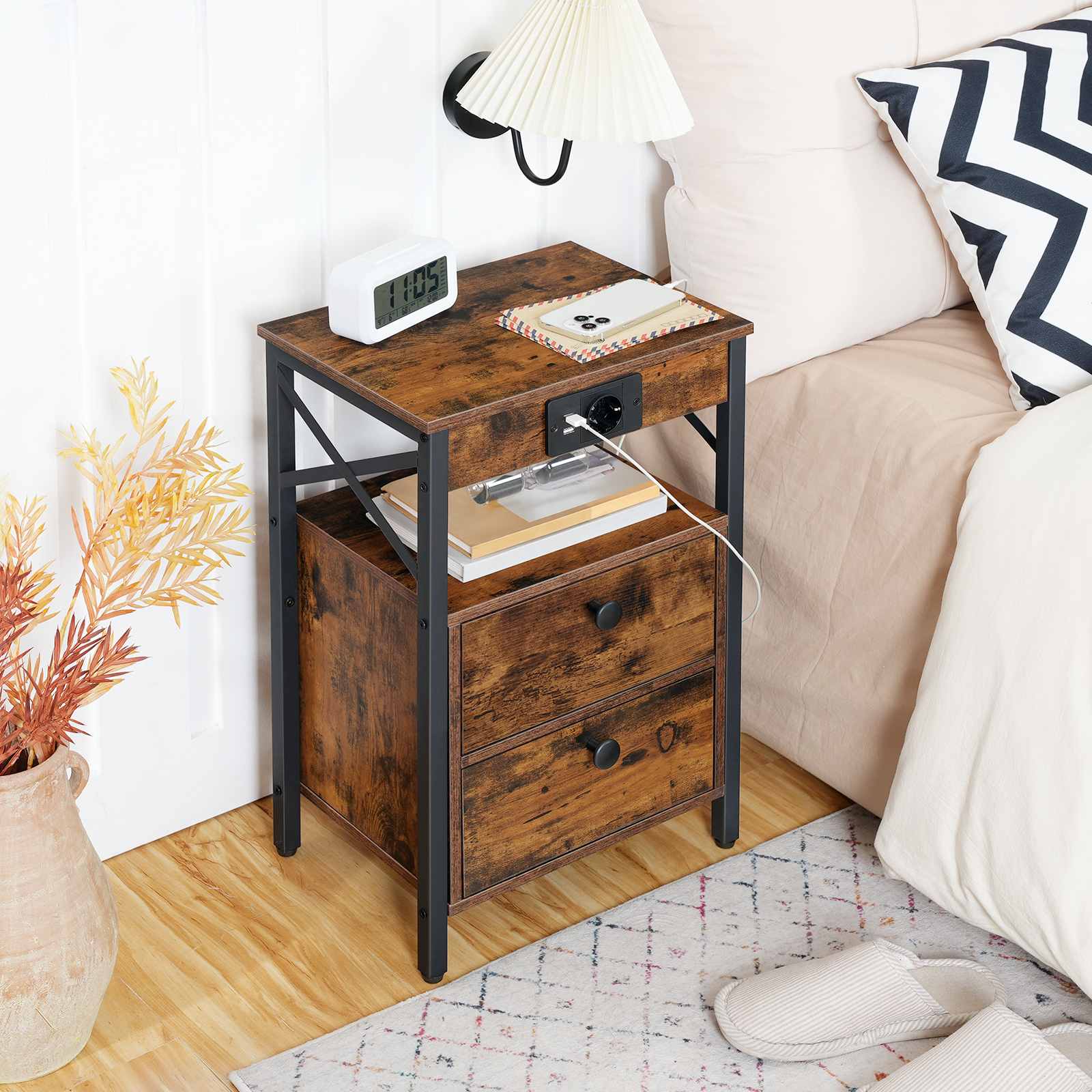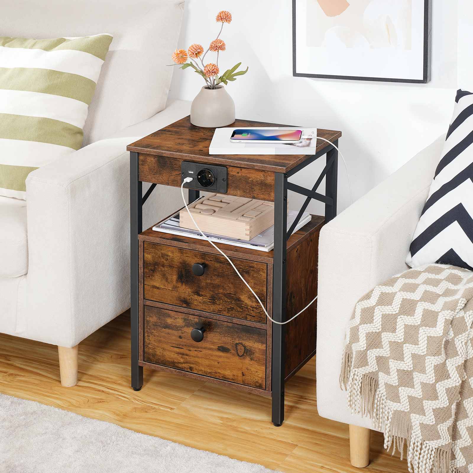 Comodino con stazione di ricarica, Tavolino multifunzionale dotato di 2 Cassetti pieghevoli e contenitori multistrato, Piedini regolabili, Marrone/Nero vintage, Adatto per soggiorni e camere da letto