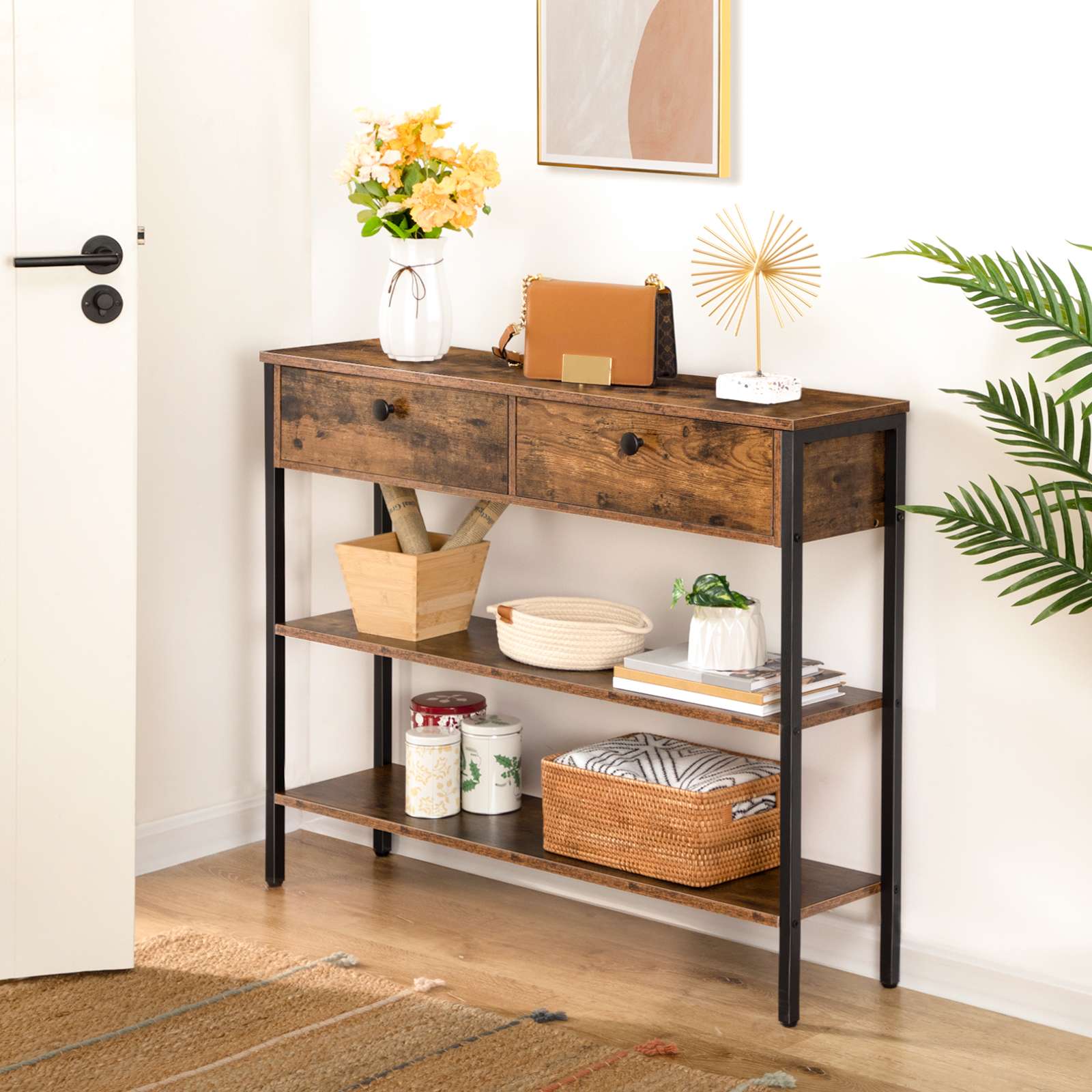 Marrone vintage & Consolle nera con 2 Cassetti e 2 Scaffali, Tavolino da divano robusto con struttura in metallo, Adatto per Ingresso, Corridoio e soggiorno