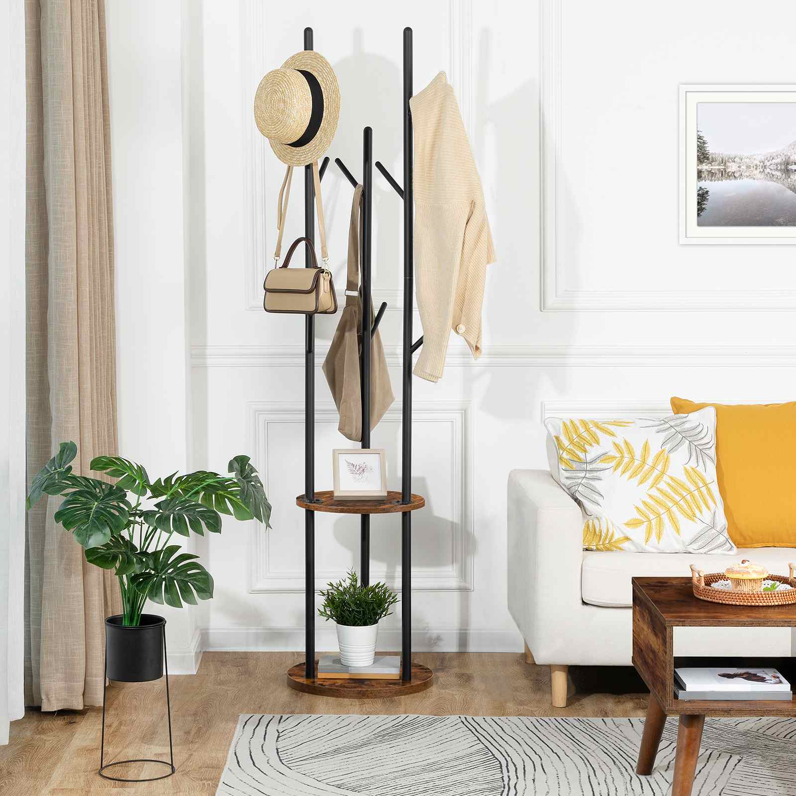 Design per risparmiare spazio: With an overall height of 175cm, this coat rack is specifically designed for narrow entryways and hallways. It occupies minimal floor space while providing ample storage capacity for clothing, sciarpe, borse, books and potted plants on the 2 ripiani inferiori.