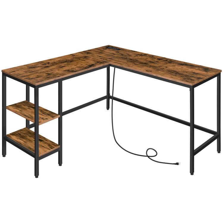 scrivania per computer a forma di L con stazione di ricarica, scrivania angolare industriale con ripiani regolabili, Studia Workstation per Home Office, marrone rustico e nero stabile e salvo spaziale