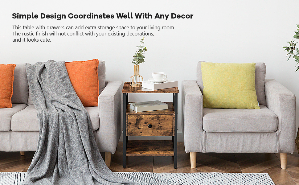 set da comodino 2, tavolo da fine con cassetto e 3 scaffali di stoccaggio, tavolino in stile industriale retrò, per soggiorno, camera da letto, Assemblaggio facile, marrone rustico
