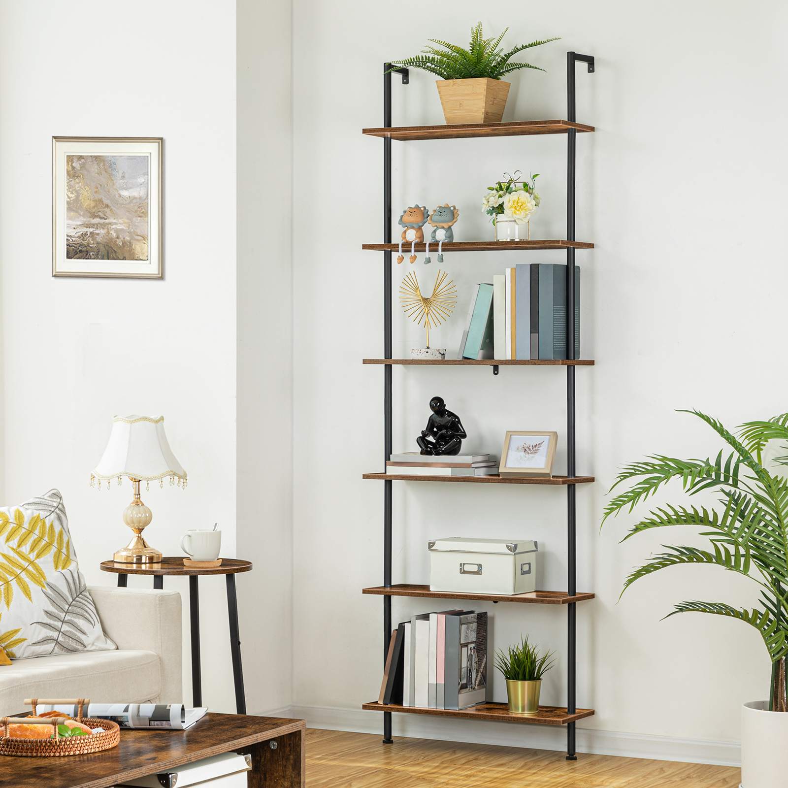Scaffale a scala a parete a 6 livelli fai-da-te, Libreria verticale in legno & Scaffali di stoccaggio, Adatto per l'ufficio di casa, Camera da letto, Marrone rustico & Nero