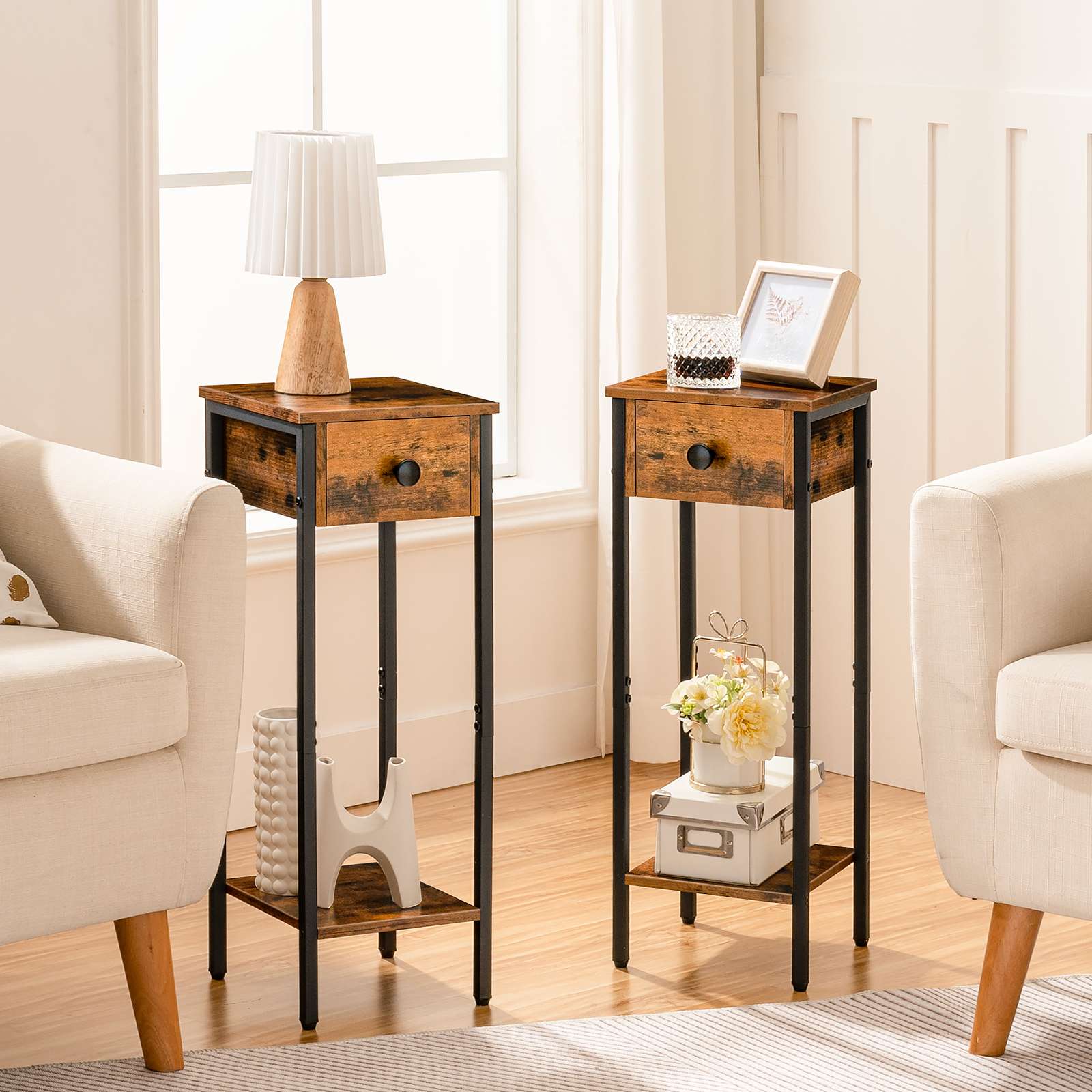 Elegant and Versatile Appearance: This set of tall bedside tables adopts a combination of rustic brown and classic black, presenting a minimalist industrial style that can be seamlessly integrated with various home decoration styles. It is applicable to both living rooms and bedrooms, delivering reliable performance in diverse scenarios.