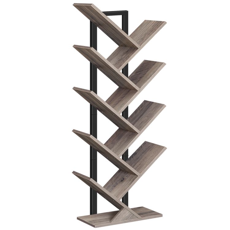 libreria ad albero, 9-scaffali in legno della libreria di livello, rastrelliere in piedi da pavimento, per la visualizzazione di CD, Libri in soggiorno, ufficio a casa, porta di stoccaggio in legno per camera da letto, grigio