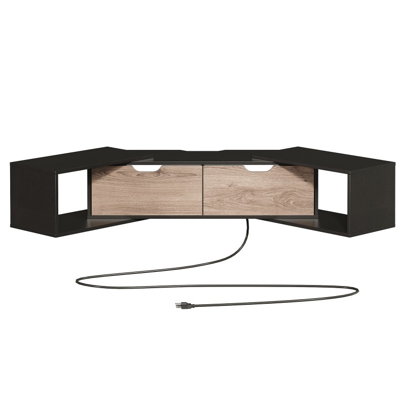 Supporto TV galleggiante con presa di corrente, Centro di intrattenimento galleggiante in noce e angolo nero, Centro di intrattenimento montato a parete con deposito per soggiorno, Sotto lo scaffale televisivo