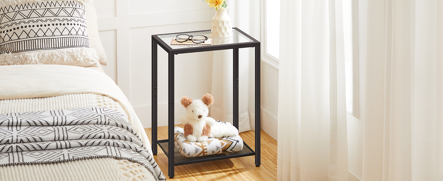 - Dimensione giusta, carico elevato: sono un comodino compatto con dimensioni 15.7"l x 11.8"W x 21.7"H. mi esibisco bene in tutti gli spazi limitati. 4 Il vetro temperato spesso mm collabora bene con la struttura in metallo per garantire la mia capacità di carico fino a 44 libbre e il mio sedere 11 libbre
