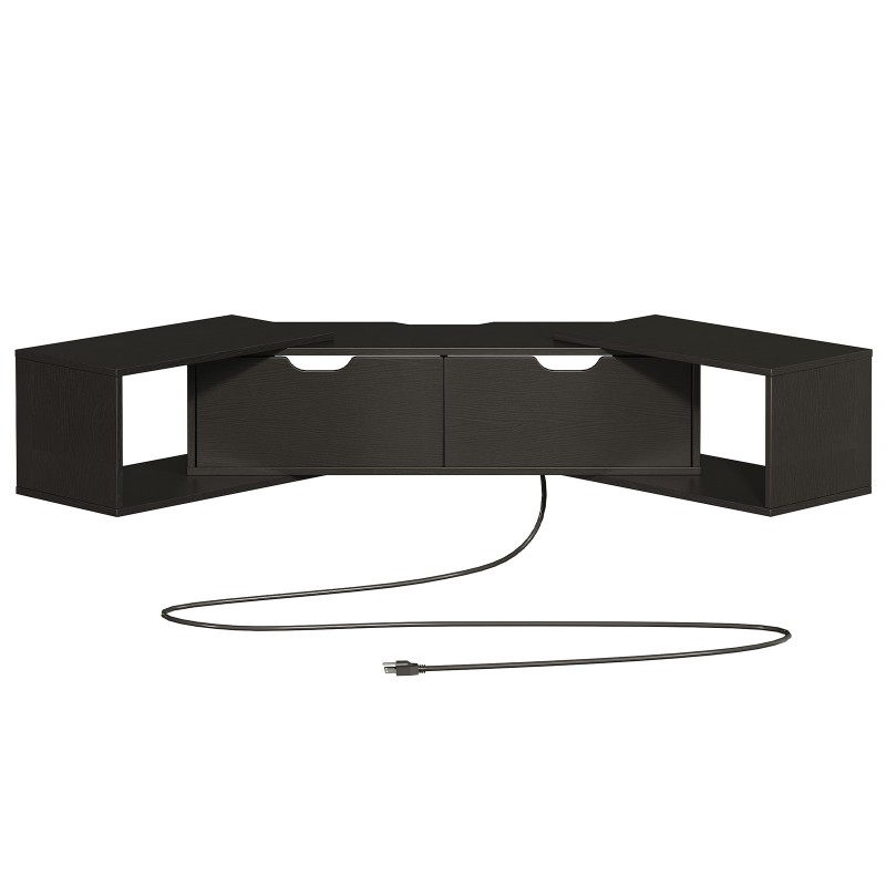 Supporto TV galleggiante con presa di corrente, Centro di intrattenimento mobile ad angolo nero, Centro di intrattenimento montato a parete con deposito per soggiorno, Sotto lo scaffale televisivo