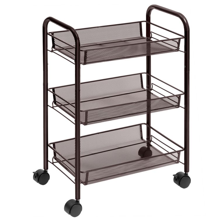 carrello mobile, 3-carrello di stoccaggio in maglie di livello, carrello multifunzione con 3 Cestini a filo regolabili e ruote bloccabili, facile da montare, per casa, cucina, ufficio, marrone