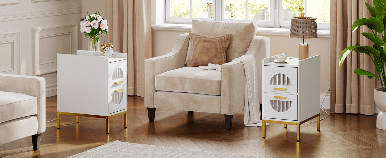 Tavolino stretto con stazione di ricarica, Comodino sottile per piccoli spazi, Tavolino con 2 Cassetti, Comodino in stile moderno, per Casa, Camera da letto, Soggiorno, Bianco e Oro