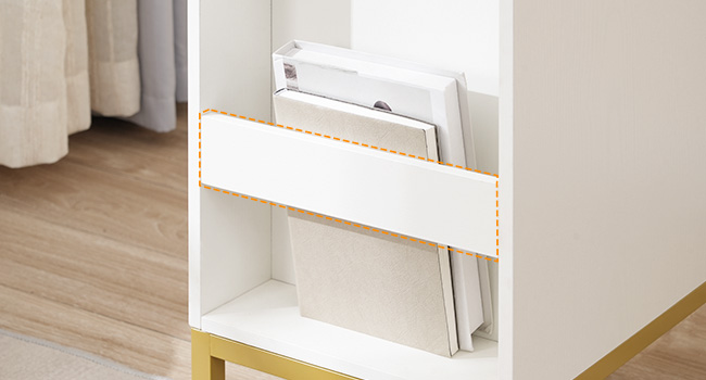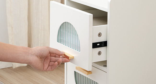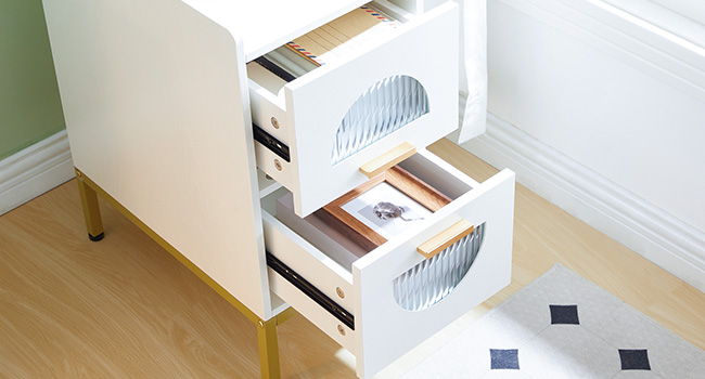 - Comodino moderno e lussuoso: Il comodino presenta una struttura semplice con una combinazione di colori bianco e oro, generoso e nobile. Il vetro rigato semicircolare, con il suo effetto semioscurante, aggiunge un elemento di design garantendo trasparenza allo spazio
