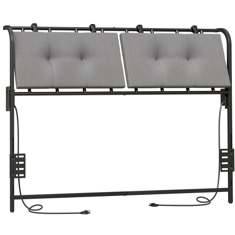 testiera matrimoniale, testiera imbottita con 2 stazioni di ricarica, Struttura della cornice metallica, rivestimento in lino regolabile con dispositivo di fissaggio, Adattatore del telaio del letto incluso, nero e grigio