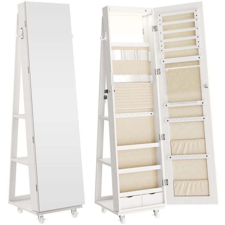 360 Mobile di gioielli rotanti con luci, Armadio per gioielli con specchio a figura intera, Armadio portagioielli con serratura, Specchio per il trucco a LED integrato, Regalo creativo, Bianco