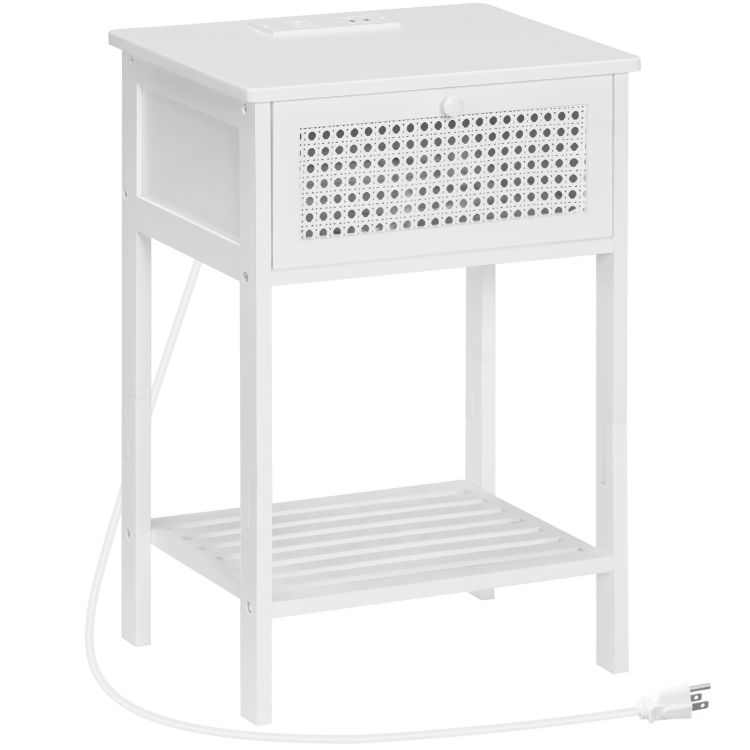 bamboo end table with charging station, rattan nightstand with flip-down door drawer, Tavolino per piccolo spazio, sofa side table easy to assemble, per camera da letto, soggiorno, white wt108ubz01