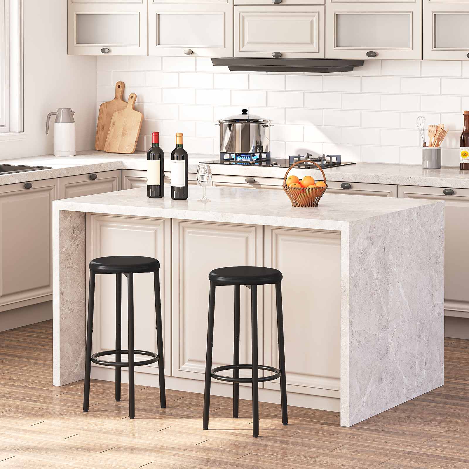 Multi-Szenario Kompatibilitéit: Dëse Set vun zwee Konter Héicht Bar Hocker ass entwéckelt fir nahtlos mat de meeschte Standard Bar Schalter a Kicheninselen ze passen. Et ass gëeegent fir verschidden Ëmfeld, inklusiv Wunn-Iesssäll fir Famill Iessen, Wunnzëmmer fir geleeëntleche Kaffi Versammlungen, a kommerziell Caféen, treffen souwuel doheem wéi och Betrib Besoinen.