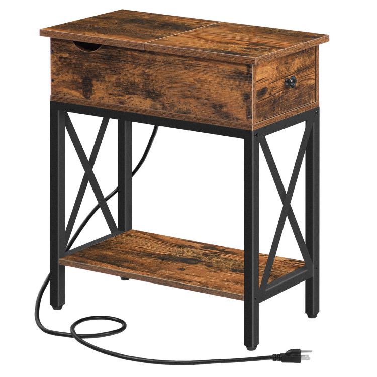 Schmuel Enn Dësch mat Opluedstatioun, Nuetsstand mat Tirang & USB Ports & Power Outlets, Flip Top Säit Table fir kleng Plazen, Wunnzëmmer, Schlofkummer, Stabil a robust, Rustikal Braun