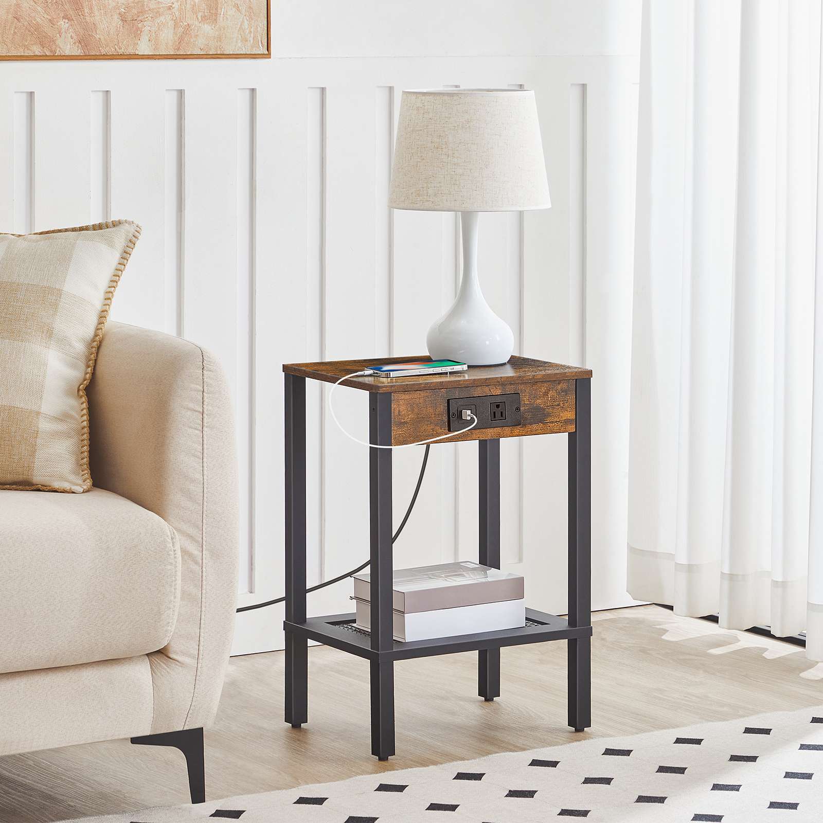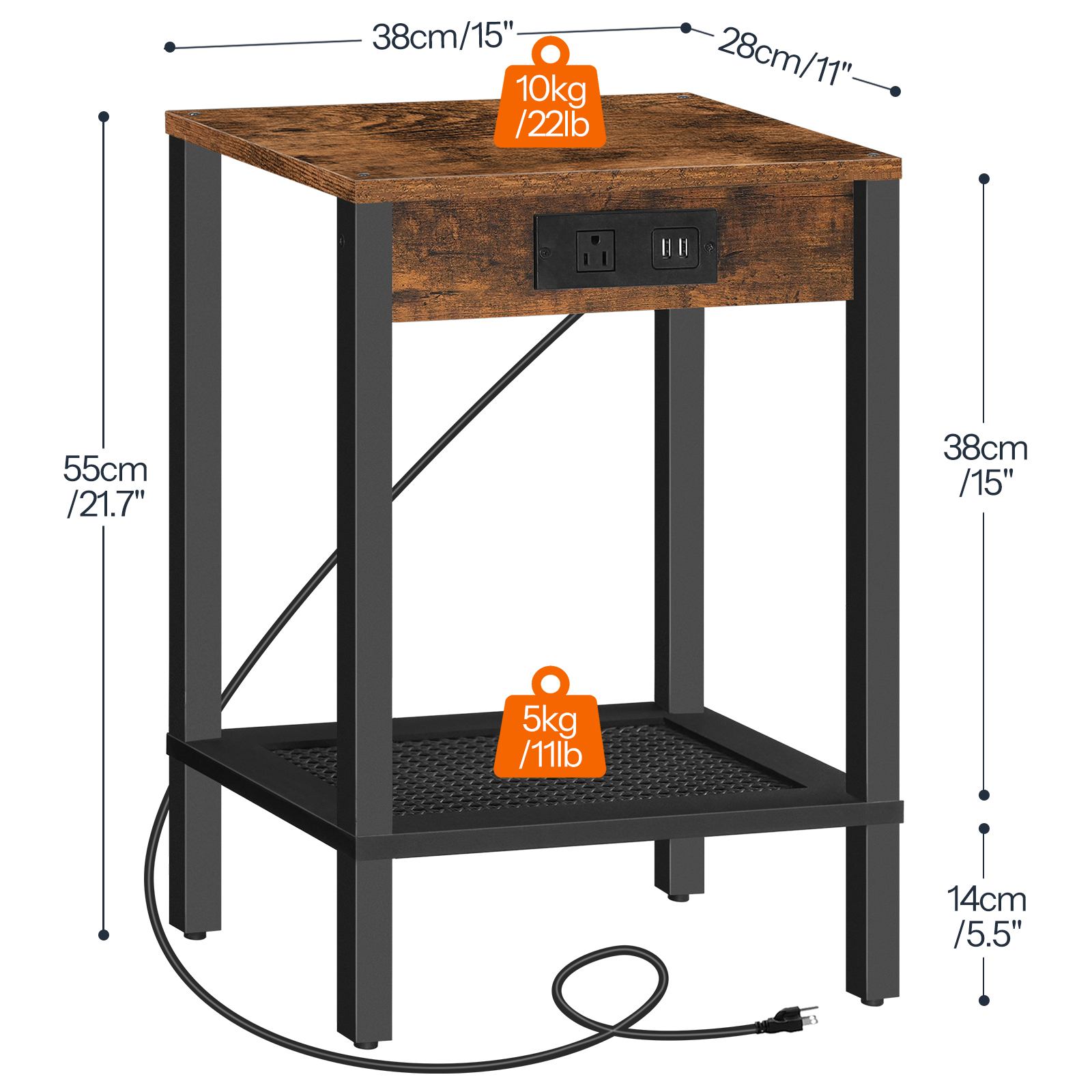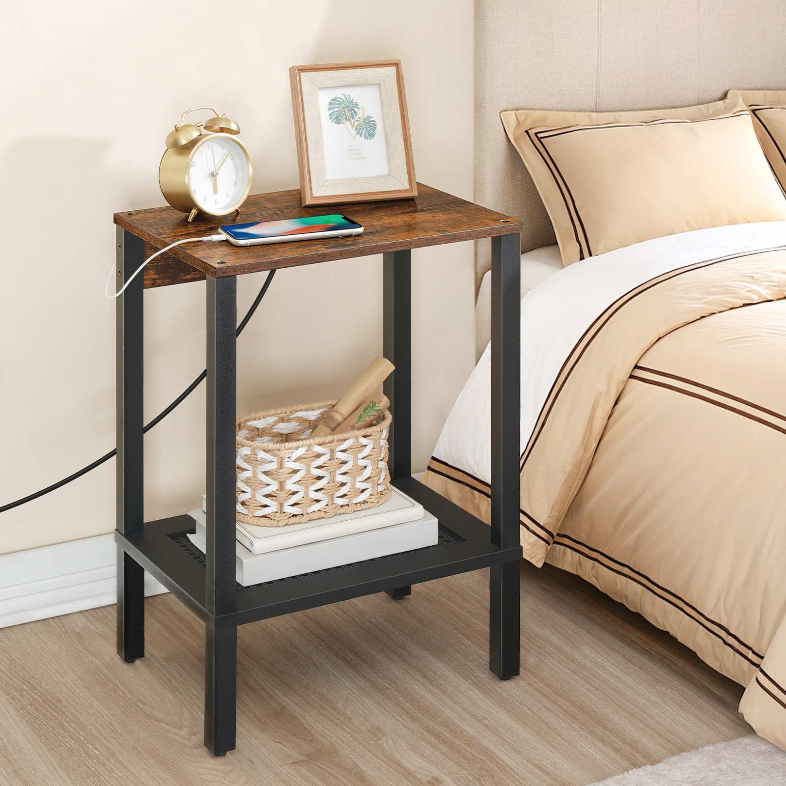 Side Table mat Opluedstatioun, Enn Dësch Equipéiert mat USB Häfen an AC Outlet, Nuetsstand mat Späichere Regal, Faux Rattan Dekoratioun, Suitable for Living Room and Bedroom, Rustikal Braun & Schwaarz