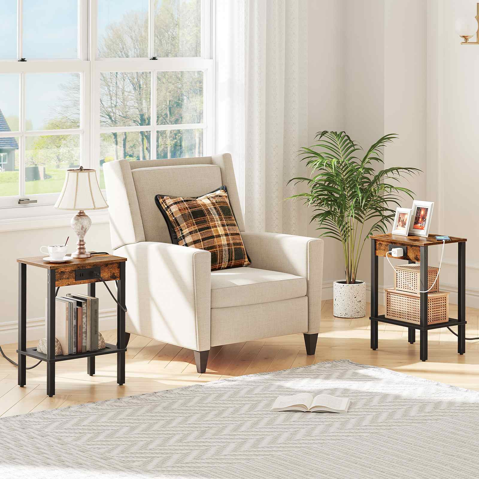 Integréiert Opluedfunktioun: Each end table is configured with 1 AC Outlet an 2 USB Opluedstatiounen Häfen, suergt genuch Opluedstatiounen Interfaces fir verschidden elektronesch Apparater. Dës Konfiguratioun erméiglecht et bequem Laden vu Smartphones, Pëllen, an Dësch Luuchten ouni de Besoin fir Benotzer hir Better oder Canapéë verloossen, effektiv eliminéiert d'Onbequemlechkeet vun der Sich no zousätzleche Stroumsockets.