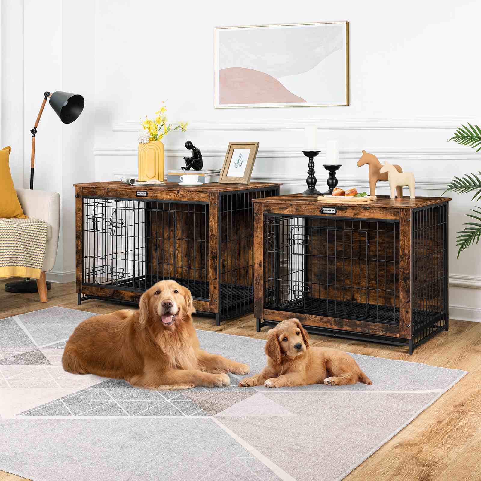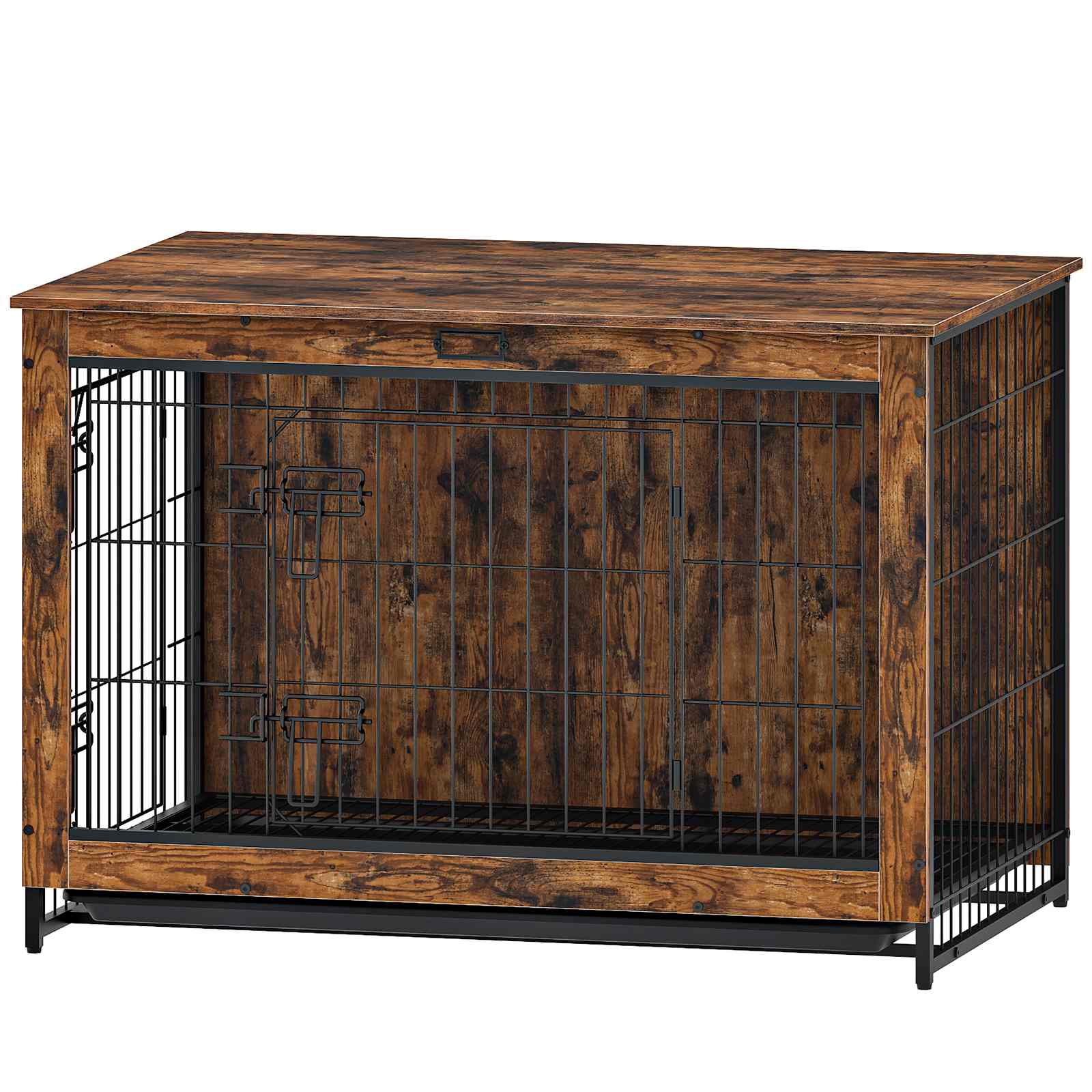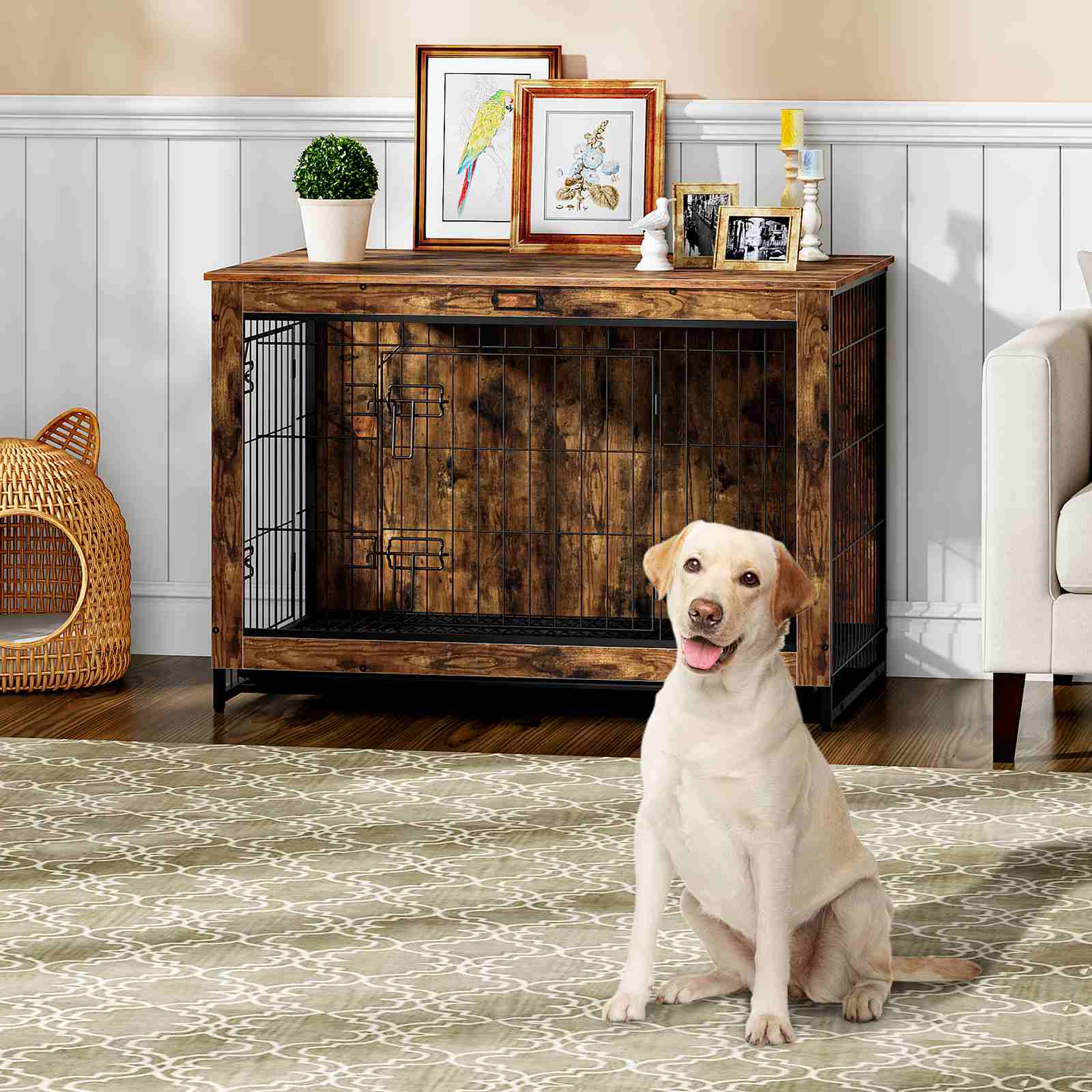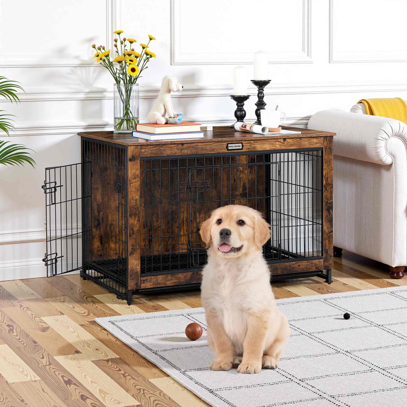Dual-Door Access Design: This furniture-style dog crate features front and side doors for convenient pet access. Constructed of particleboard and steel, it offers easy maintenance, staark strukturell Stabilitéit, and excellent chew resistance.