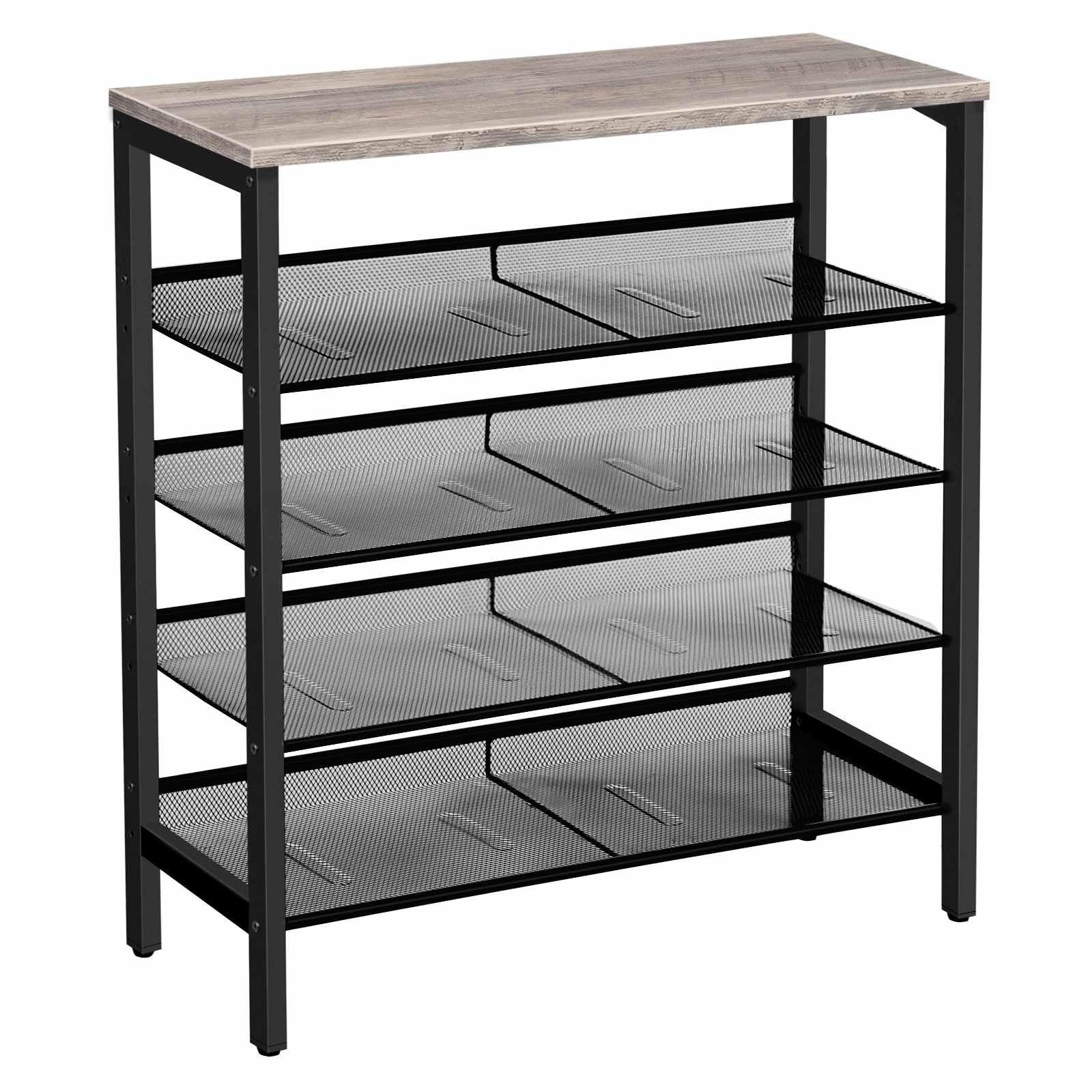 Upassbar Regal Design: Equipped with a wide open top and adjustable mesh shelves, the shoe rack offers ample space for the whole family's shoes. Each mesh shelf's angle can be freely adjusted to optimize entryway organization; for high heels and boots, a mesh shelf can be removed for proper storage.