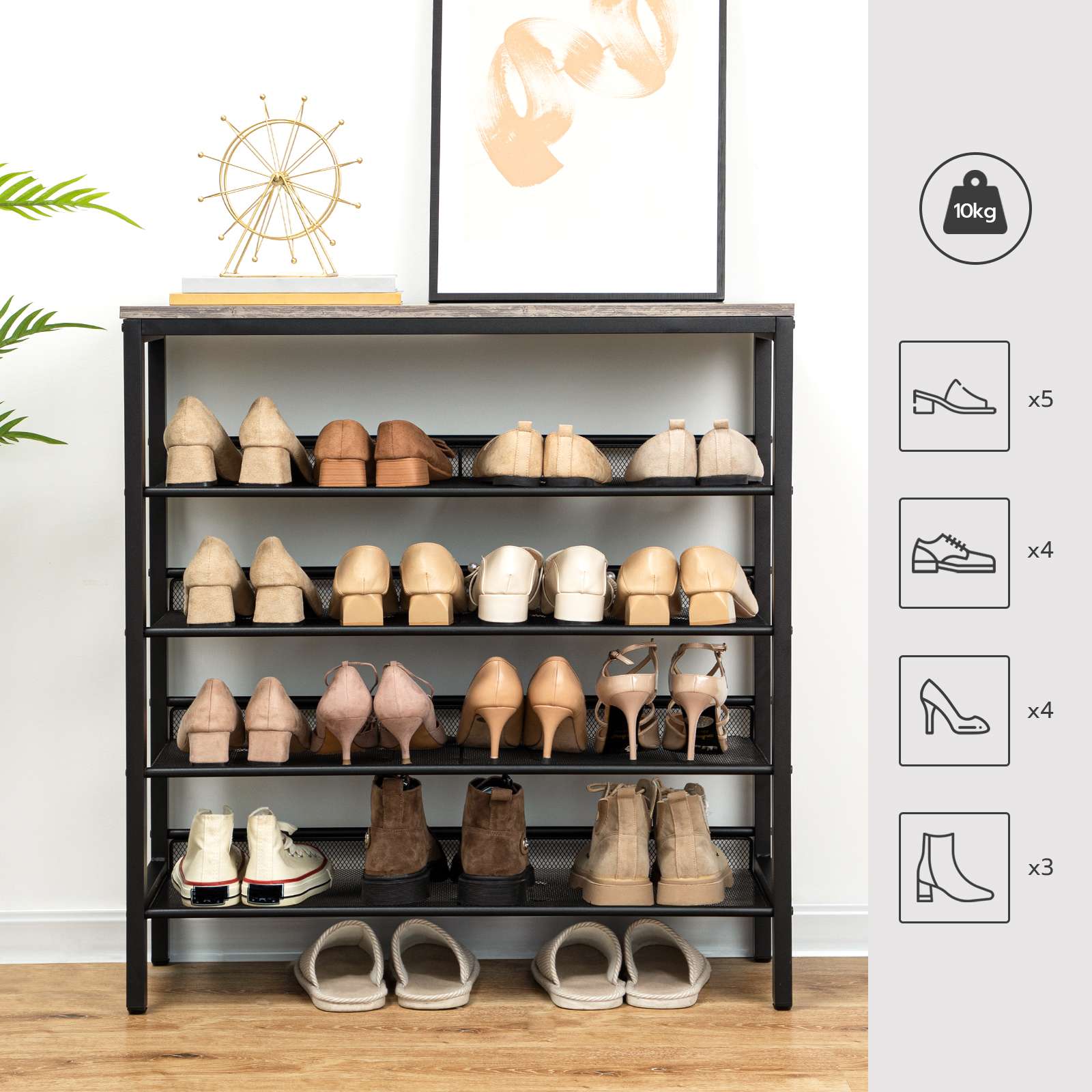 Excellent Load-Bearing Capacity: Unlike non-woven shoe racks with poor load-bearing, this shoe rack adopts wooden panels that not only enhance aesthetics but also ensure a total load-bearing capacity of up to 10kg, with each layer capable of bearing 5kg, achieving both appearance and practicality.