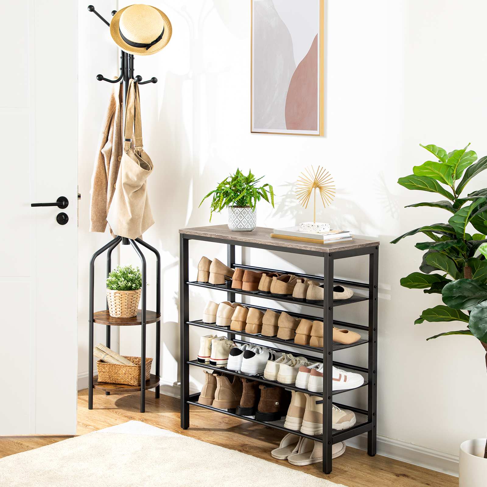 Elegant Industrial Design: This shoe rack features a sleek grey wooden panel paired with a sturdy metal frame, combining aesthetics with functionality to enhance the decor of any entryway and leave a refined impression on visitors.