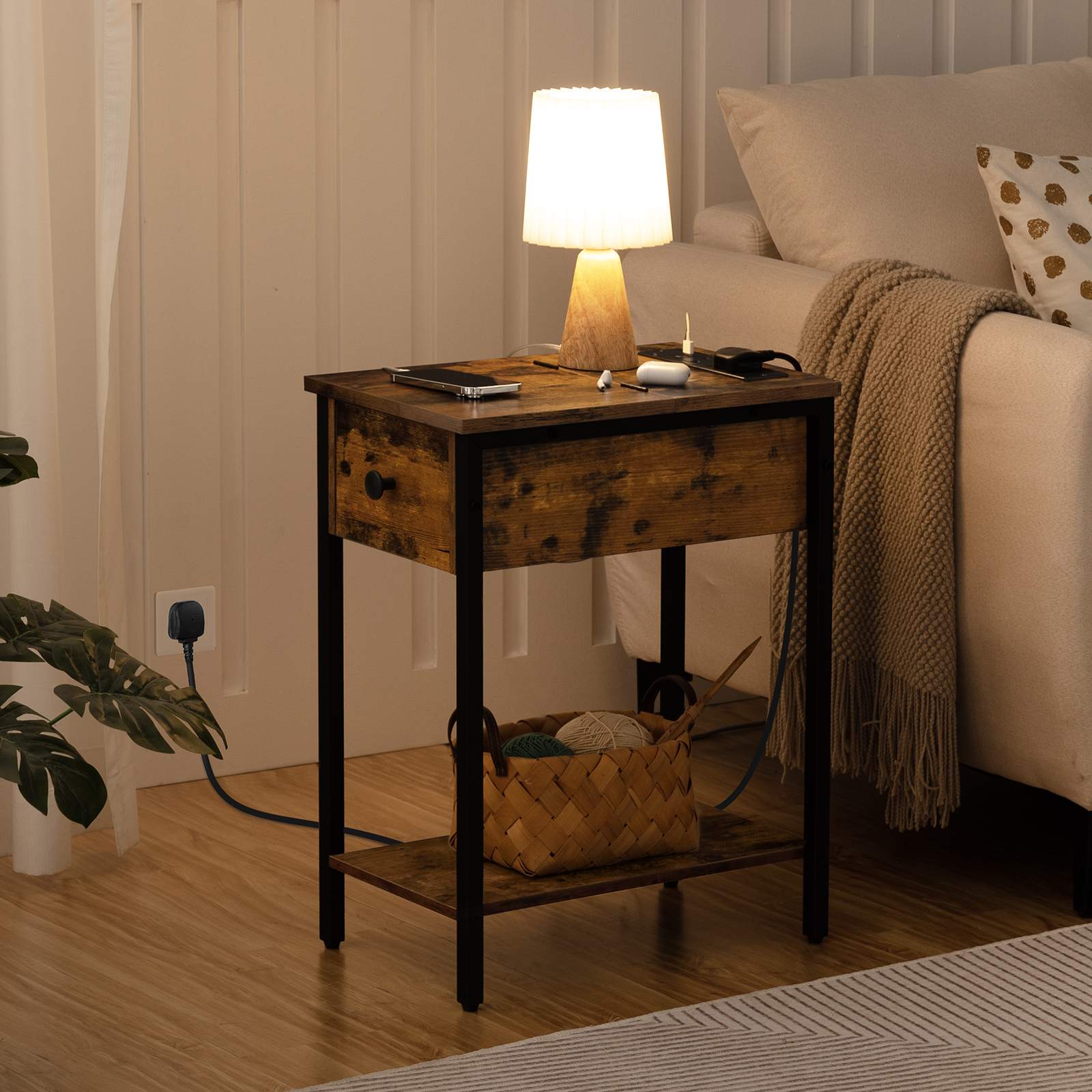 schmuel Säit Dësch, Slim Bettsahn Tabelle mat Opluedstatioun, USB Ports & Power Outlets, Nuetsstand fir Wunnzëmmer, Schlofkummer, flip Top, rustikal brong a schwaarz