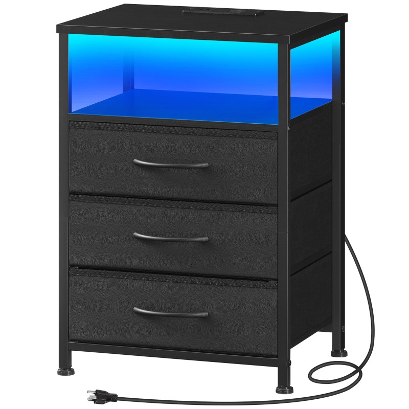 Zwart nachtkastje met laadstation en LED -licht, Nachtkastje met 3 Stoffen laden, Nachtstandaard met USB -poorten en uitlaat, Eindtafel voor slaapkamer, Slaapzaal