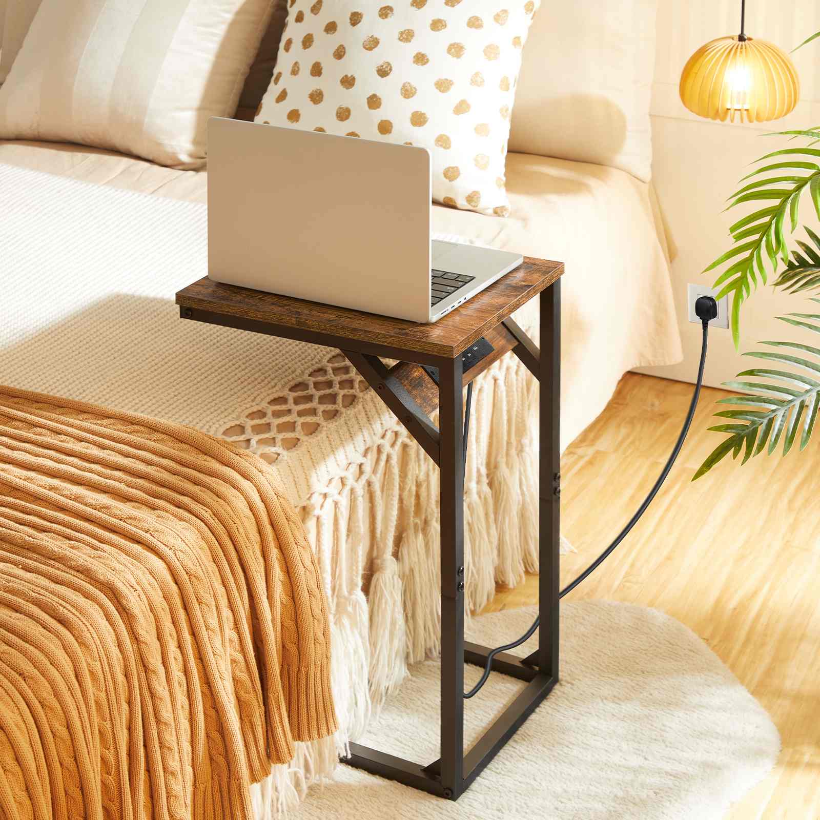 C-vormige bijzettafel, SOFA -tafel met laadstation, laptoptabel voor bank, 2 USB -poorten 2 AC -verkooppunten, smal nachtkastje met kracht, woonkamer, slaapkamer, Rustiek bruin en zwart