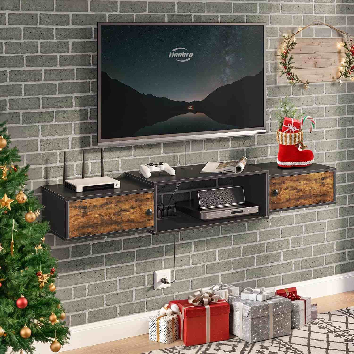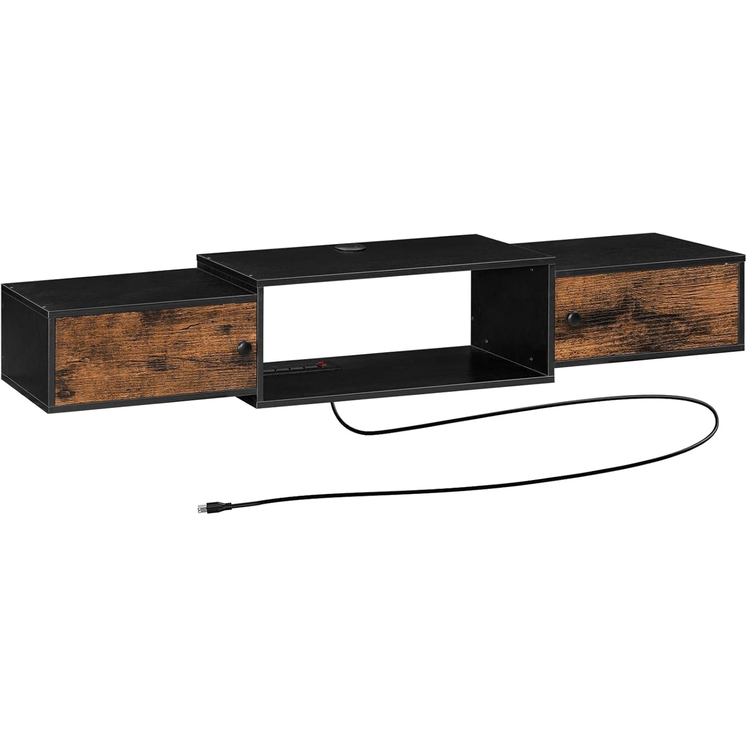 Aan de muur gemonteerde zwevende tv-standaard met stopcontact, Rustiek bruin & Zwarte mediaconsole-plankkast voor opslag onder de tv, Geschikt voor woonkamer en slaapkamer