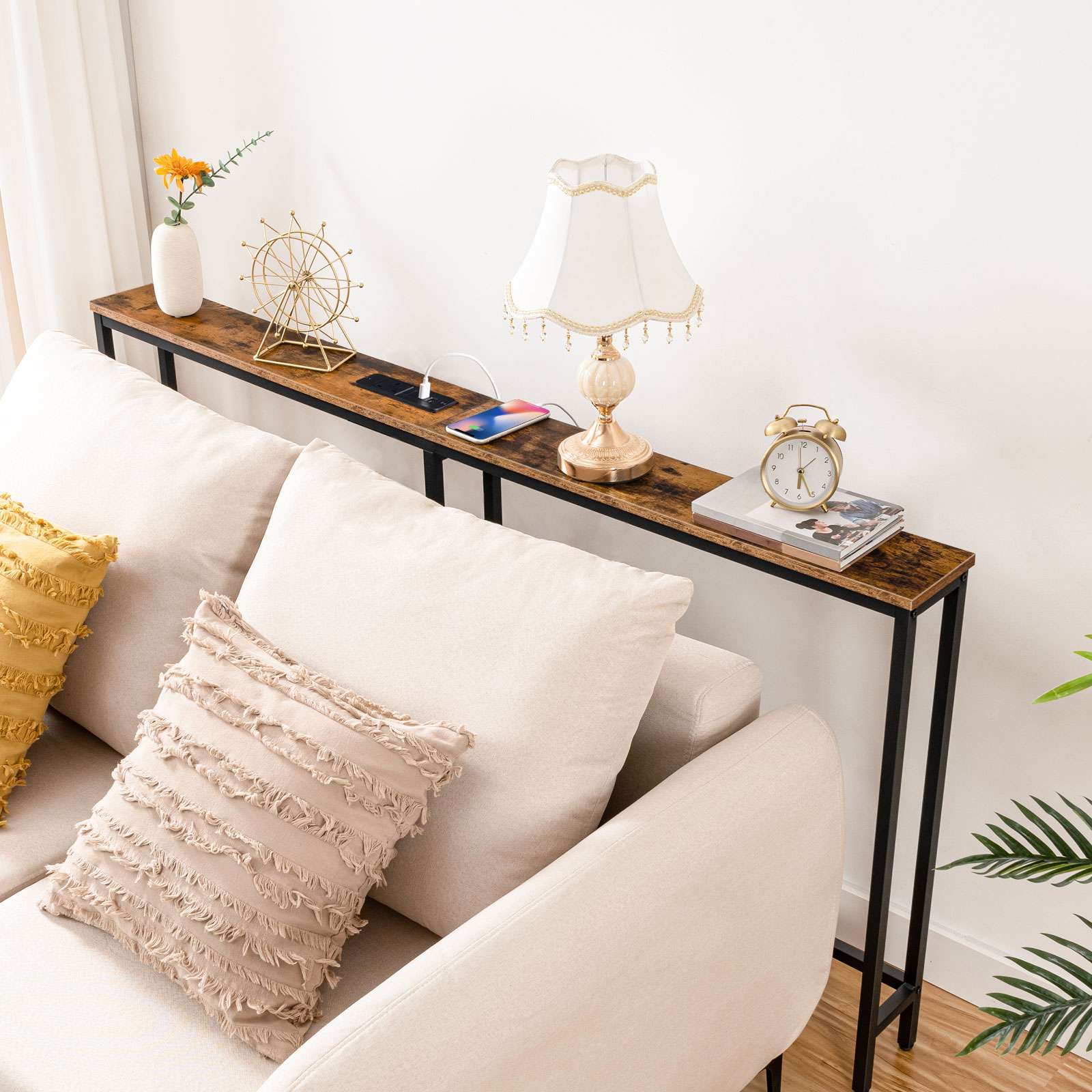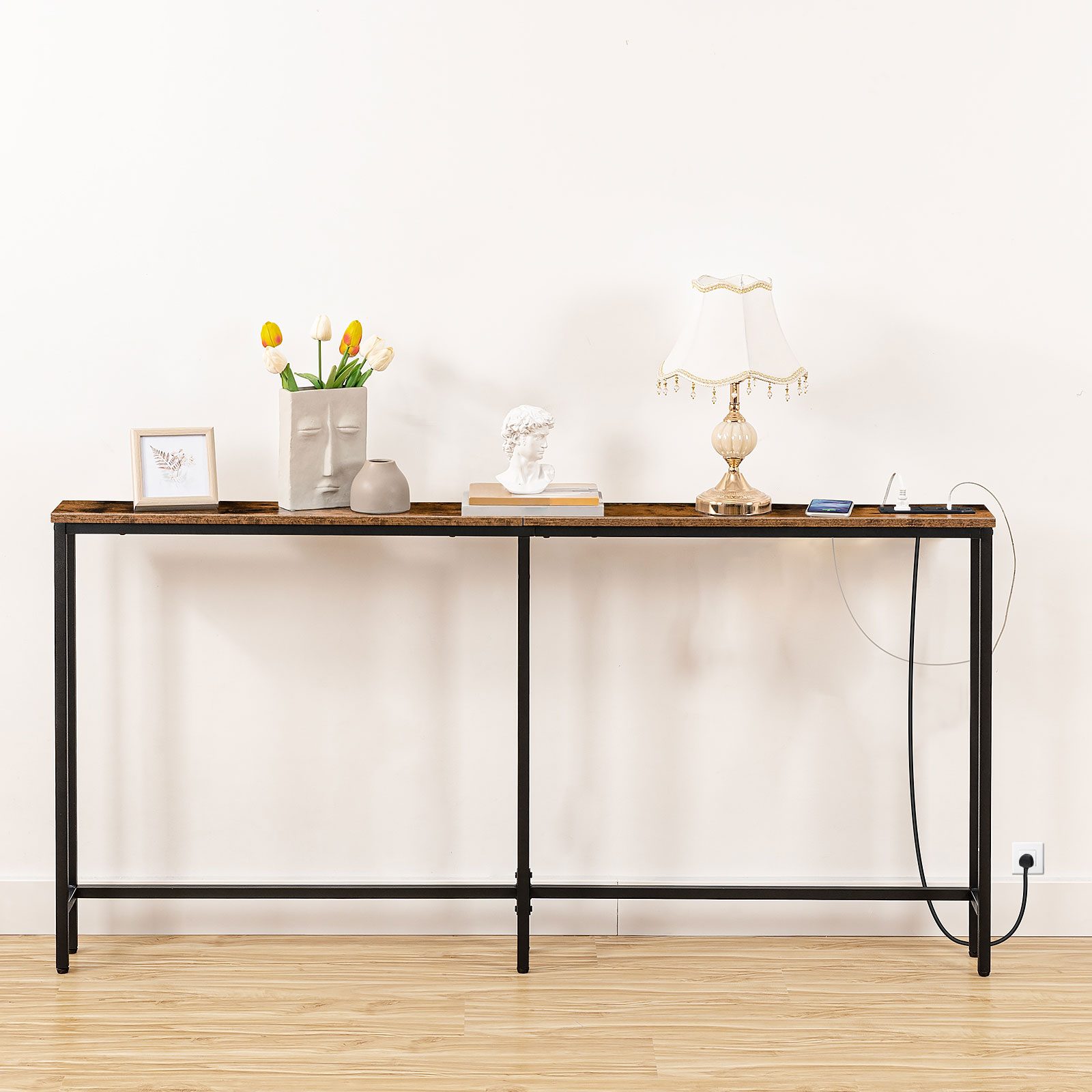 Slanke consoletafel met laadstation, 160cm Tafel achter de bank, Lange smalle consoletafel voor gang, Ingang en woonkamer, Rustiek bruin & Zwart