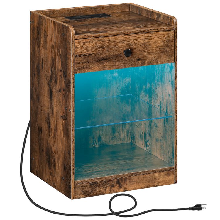 nachtkastje met laadstation en LED -lichten, bijzettafel met lade en opslagplank, eindtafel met USB -poorten en verkooppunten, voor kleine ruimte, slaapkamer, rustic brown bf603bz01