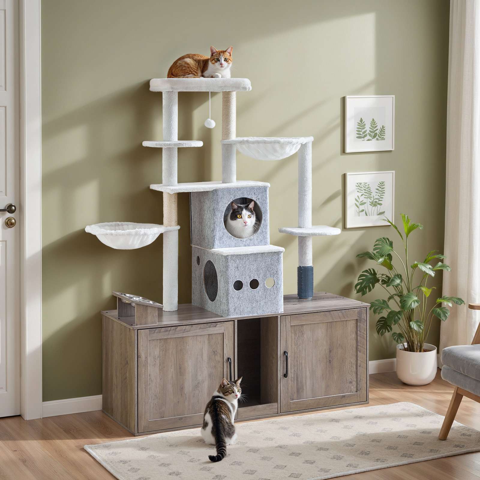 Een kattenboom combineren, kattenbak behuizing, krabbenpaal, voedingsstation, en hangmat in één geïntegreerd ontwerp, Dit kattenhuis levert alles wat uw kat nodig heeft. Het biedt privéruimte voor uw kat met behoud van netheid. Gemaakt van stevige materialen en uitgerust met een anti-tip apparaat, het zorgt voor katten’ veiligheid in alle opzichten.