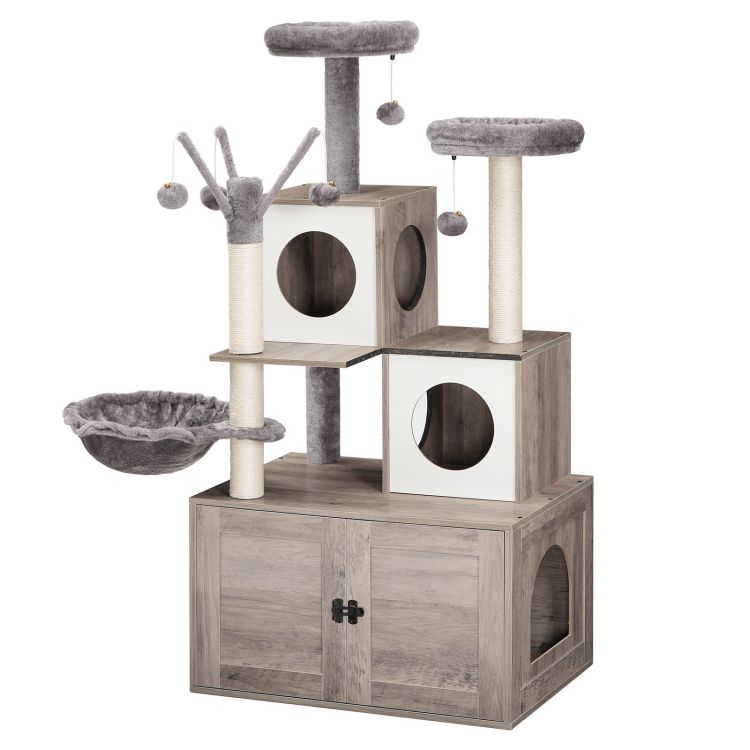 Krabpaal met kattenbakbehuizing, 2 Kattenhuizen en platforms, Kattentoren voor Binnen Cat, Verborgen kattenbakmeubilair, 2-in-1 kattenappartement met hangmatten, Krabpalen, Grijze BG37MZ03