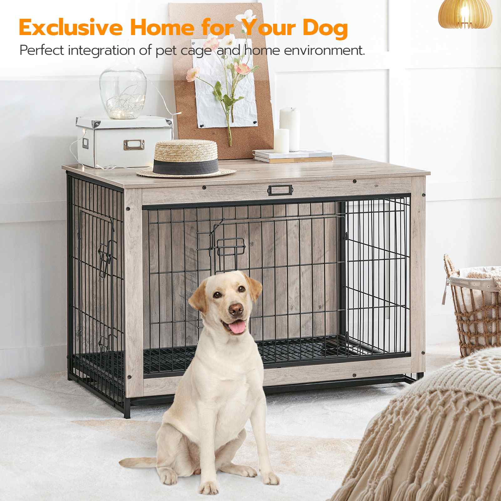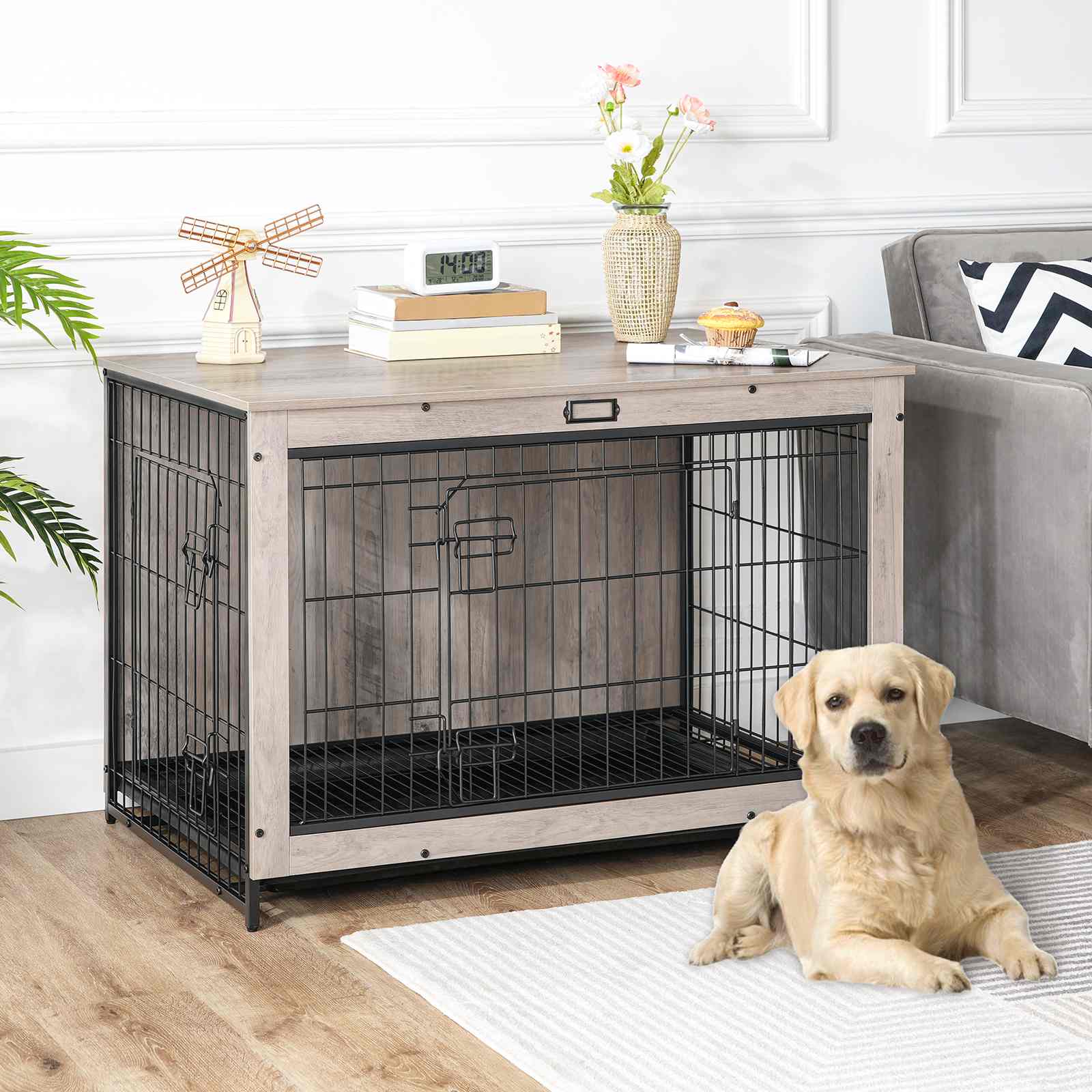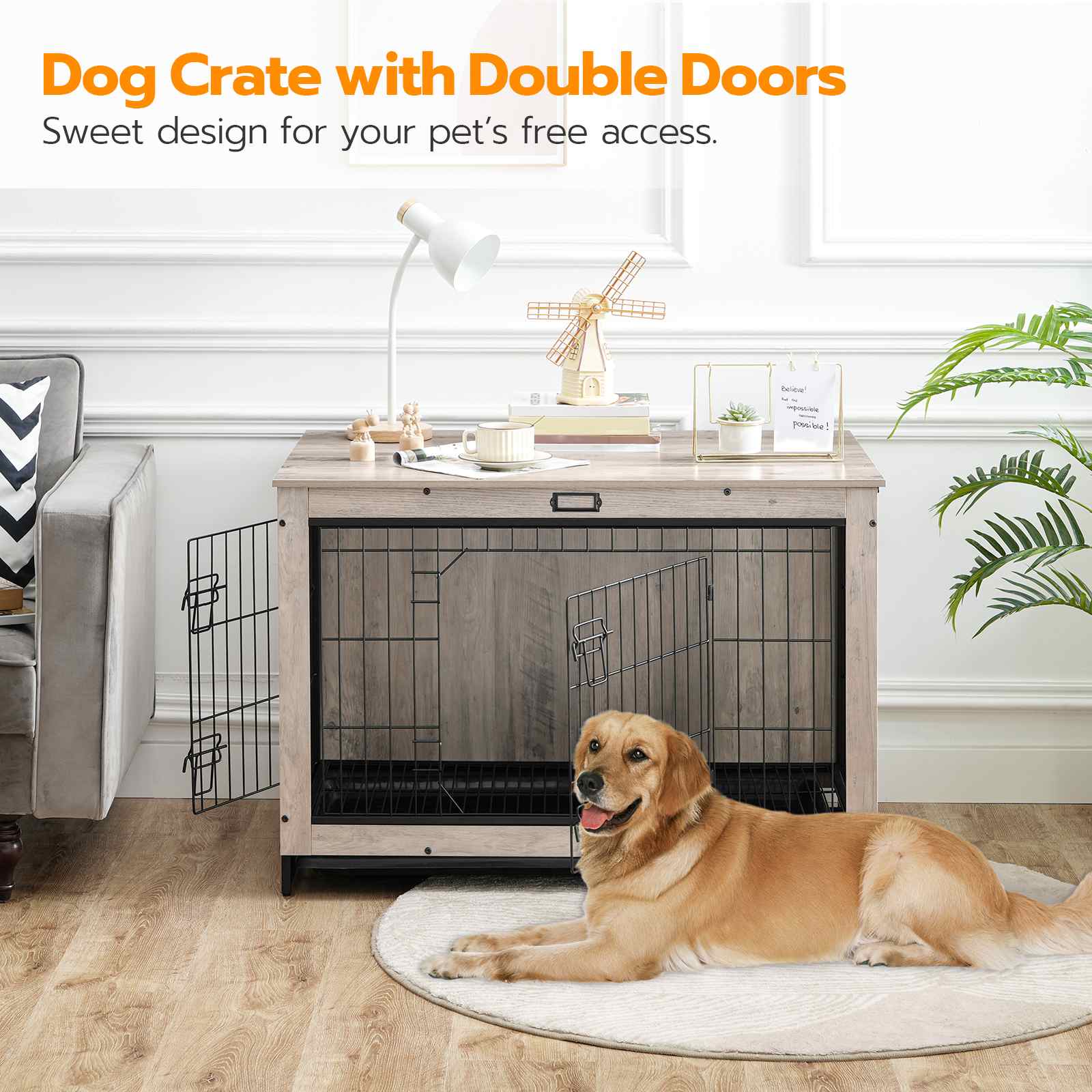 Hondenkrat meubilair, 3XL Houten Dierenkrat, 98cm Dierenmeubel met uittrekbaar dienblad, Thuisgebruik binnenshuis, Moderne bijzettafel met dubbele deur voor middelgrote/grote honden, Kauwbestendig, Grijs