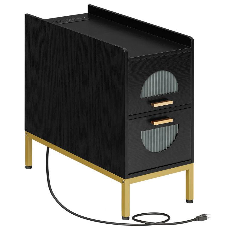 Smalle bijzettafel met laadstation, Moderne slanke bijzettafel uit het midden van de eeuw voor kleine ruimtes, Nachtkastje met 2 Laden, Nachtkastje voor thuis, Woonkamer, Zwart en goud DB48UBZ01