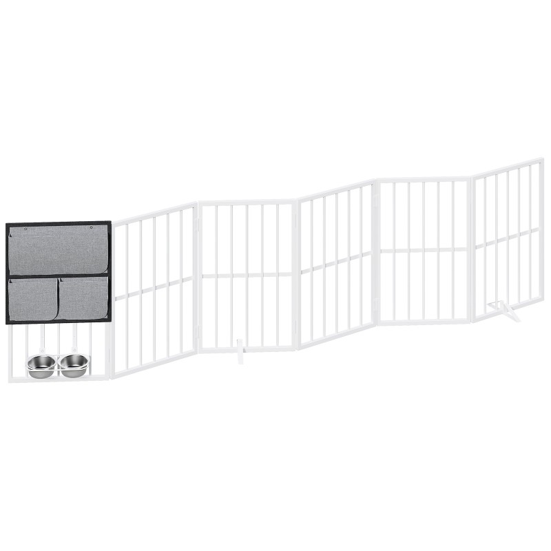 Hondenpoort binnen met hondenkommen, 94.5" Extra brede vouwhek voor deuropeningen, trap & thuis, 6 Paneel vrijstaande huisdierenpoort met steunvoeten, huisdier puppy veiligheidshek, wit