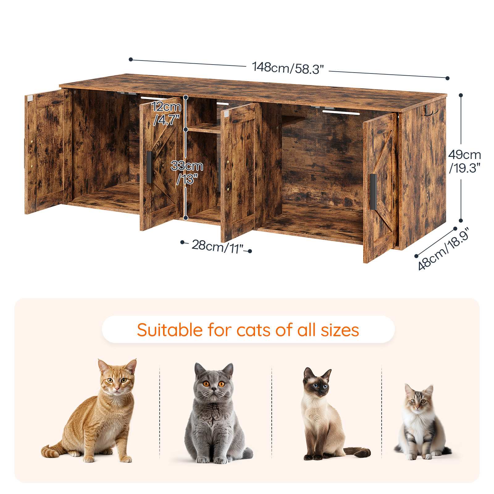 Ontwerp van kattenbak met dubbele holte: Deze kattenbakbehuizing heeft een totale afmeting van 148,1 cm (L) × 48.0cm (W) × 49.0cm (H), waar gemakkelijk twee kattenbakken in passen (maximale compatibele maat: 148.1cm (L) × 48.0cm (W)), of twee kattenbedden, of een combinatie van één kattenbak en één kattenmand. Dit ontwerp zorgt ervoor dat elke kat een onafhankelijke en privéruimte heeft voor dagelijks gebruik.