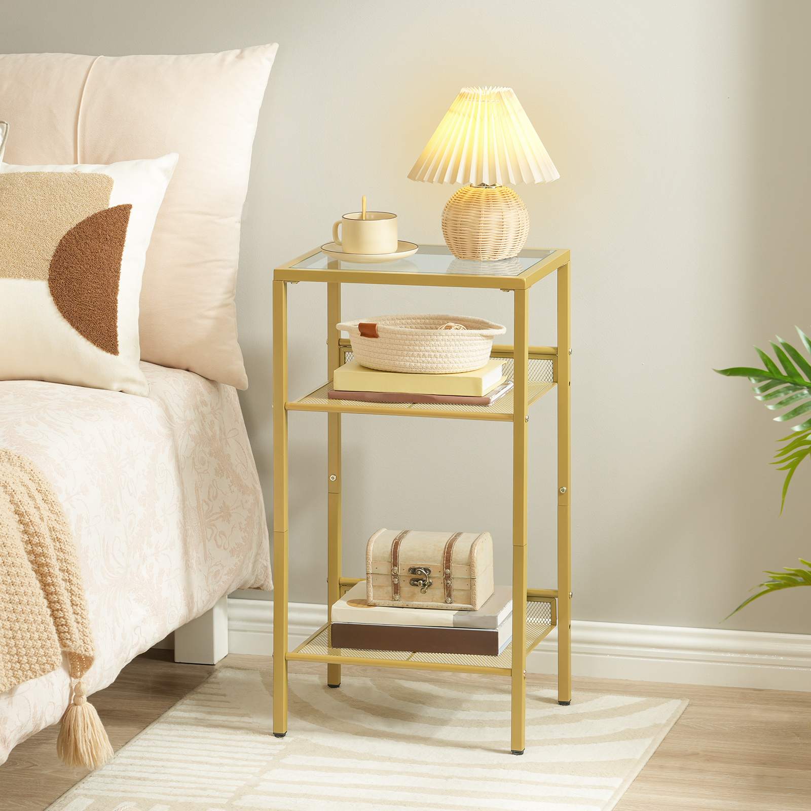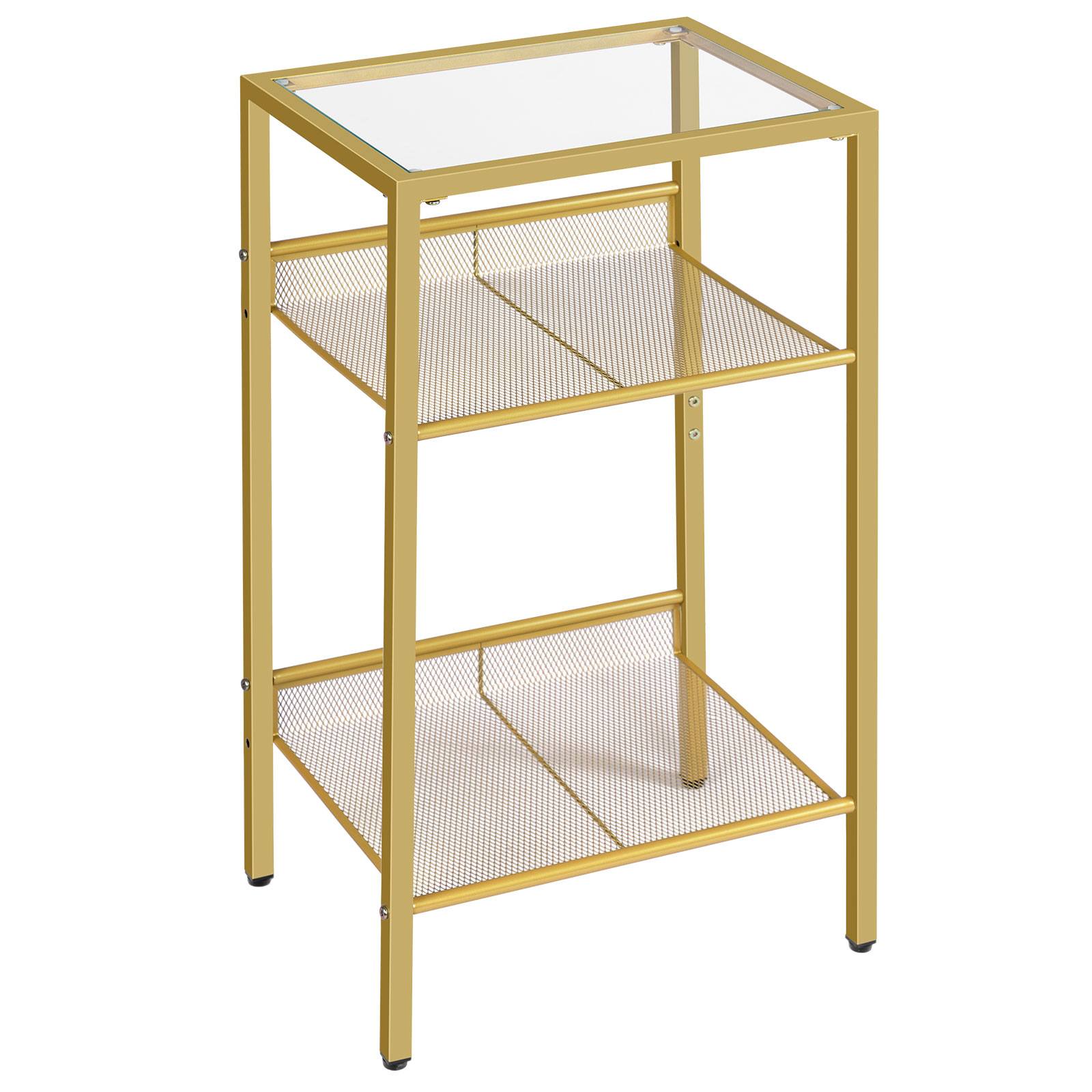 Gouden hoge bijzettafel, Telefoontafel van gehard glas met gaasplank, 3-Hoge en smalle bijzettafel voor kleine ruimtes, Bank, Woonkamer, Slaapkamer, Eenvoudige montage, Moderne stijl