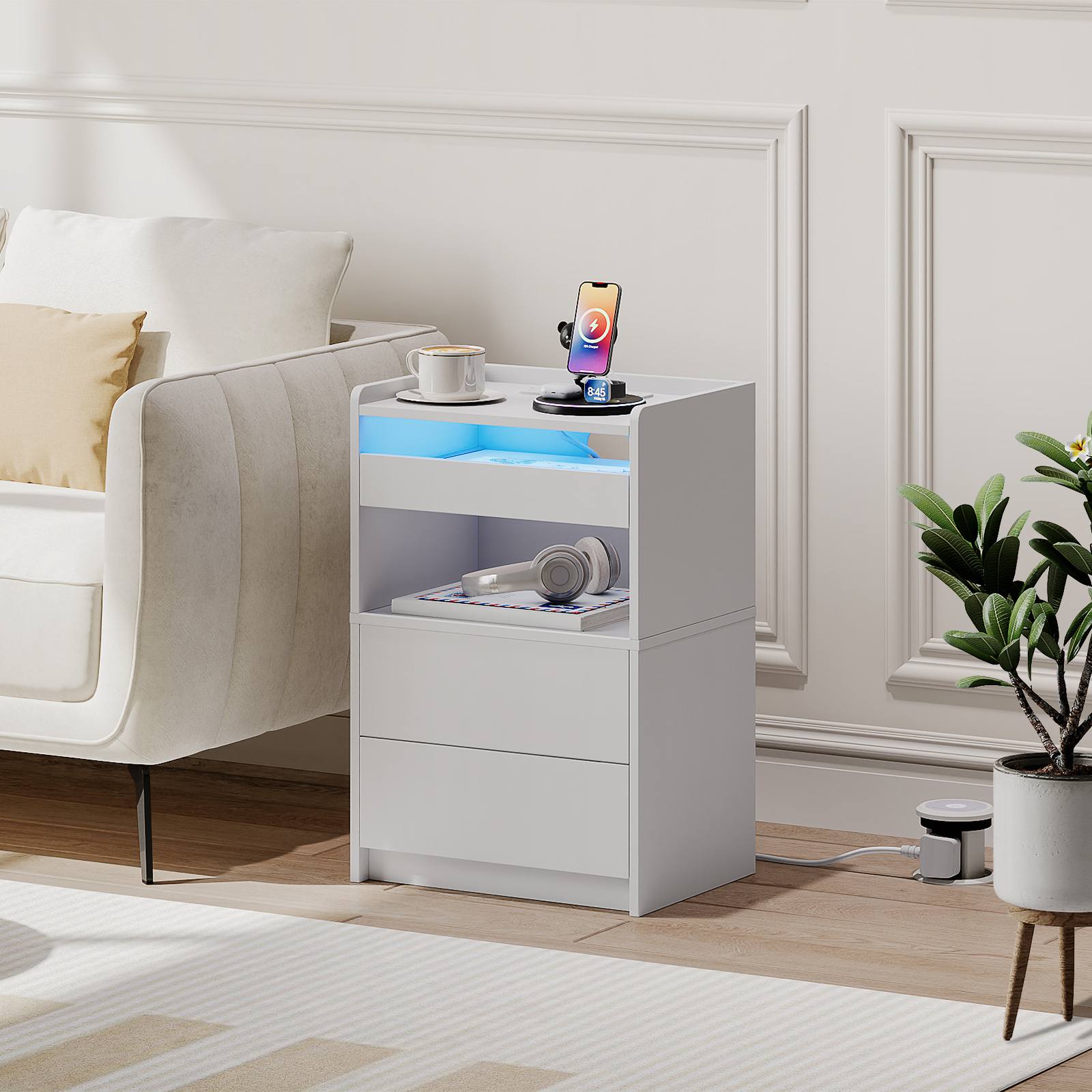 Wit nachtkastje met laadstation, Eindtafel met 20-kleuren LED-lichten, Nachtkastje met 1 AC -uitlaat, 2 USB-poorten, 3 Laden voor slaapkamer, Woonkamer, Studie, Thuiskantoor