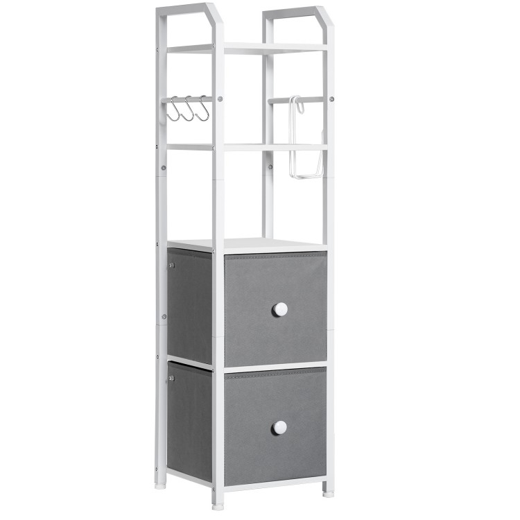 5-Tier badkamerladderplank, Smalle ladderboekenplank met 2 Laden, Opbergrek met haken en toiletrolhouder, voor badkamer, Woonkamer, Kantoor, Wit en grijs