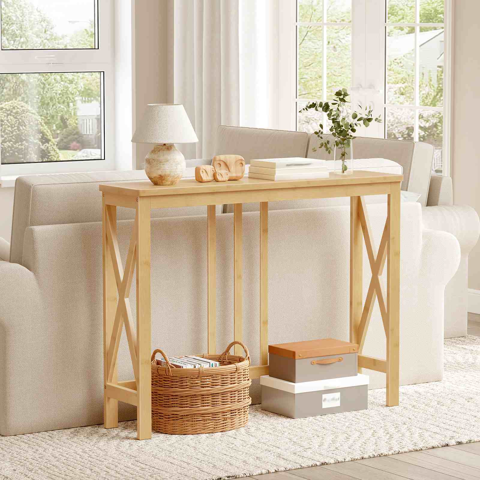 Robust Structure with X-Shaped Side Frames: The X-shaped frame design on both sides enhances the stability of this bamboo hallway table. Combined with high-density bamboo materials, it forms a solid structural system, with the tabletop supporting a maximum load capacity of 44 pounds for daily items.