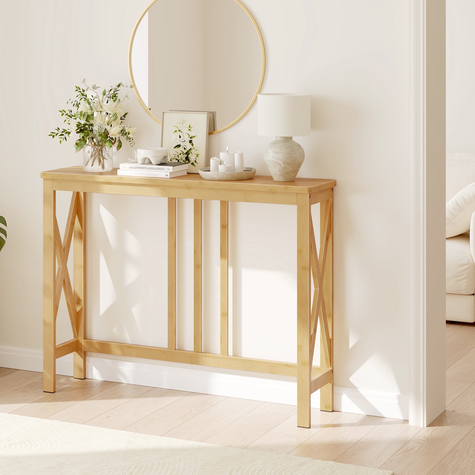 Smalle consoletafel, 39.4 Inch-instaptafel met X-vormige zijframes, Bamboe banktafel voor kleine ruimtes, Moderne halaccenttafel, Geschikt voor woonkamer en hal, Natuurlijke afwerking