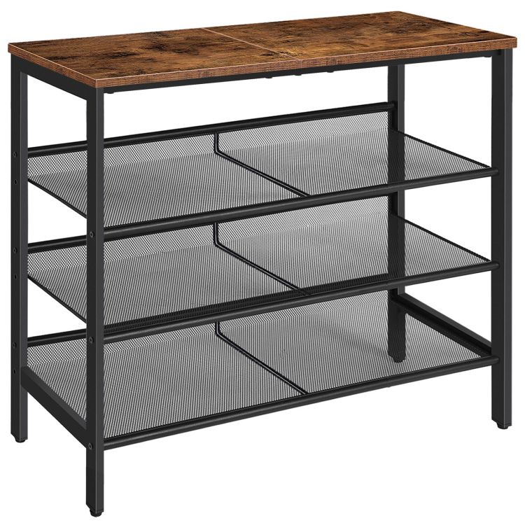 skohylle, 4-tier skohylle, Skohylle for inngangsparti, skap, holder 12-15 par sko, skooppbevaringsarrangør med 3 Metallnetthyller, solid og stabil, industriell, rustikk brun bf42xj01