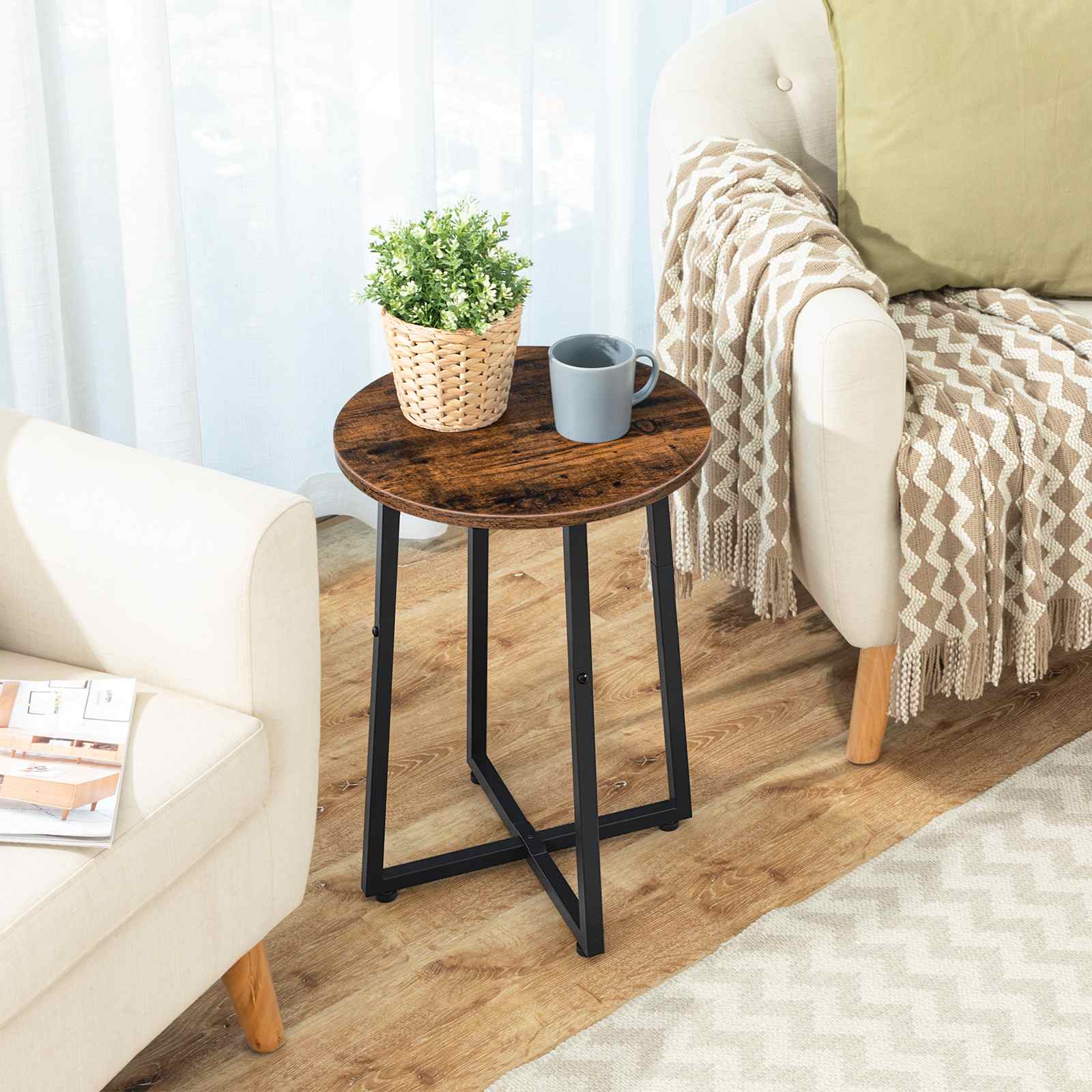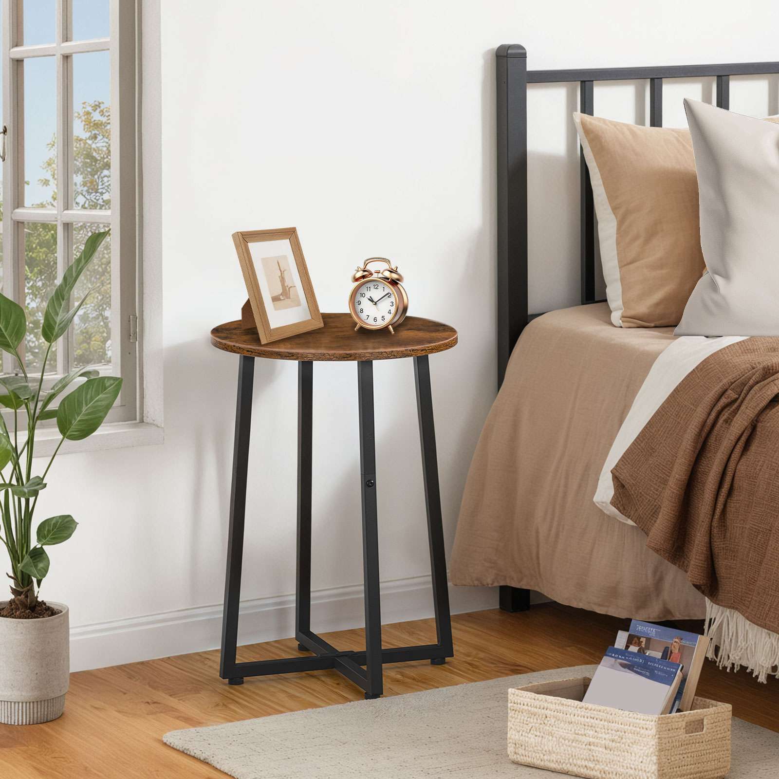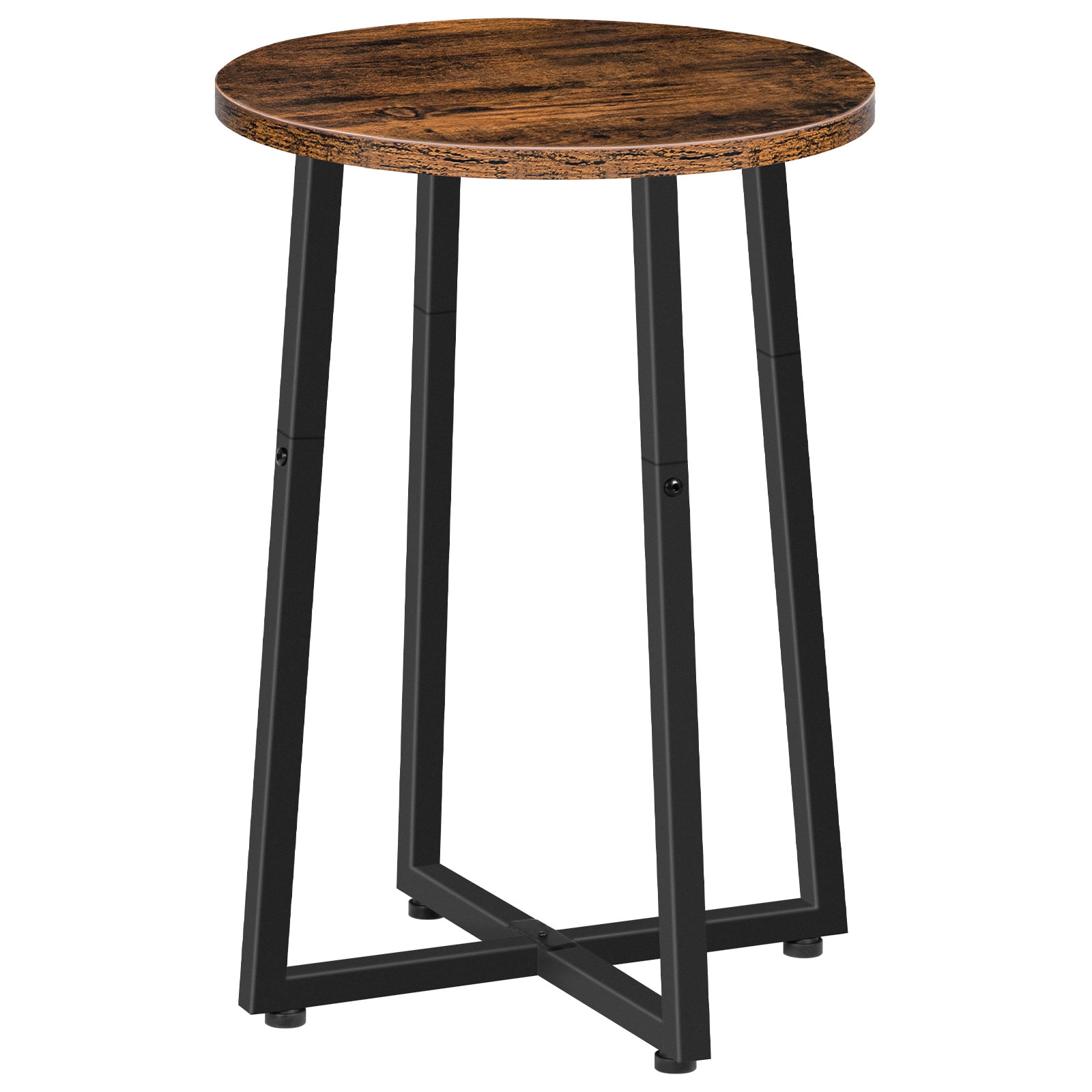 Rundt sidebord med solid X-formet metallramme, 40cm Rustikk Brun Rund Nattbord, Passer for stue, Soverom, Balkong, Kontor