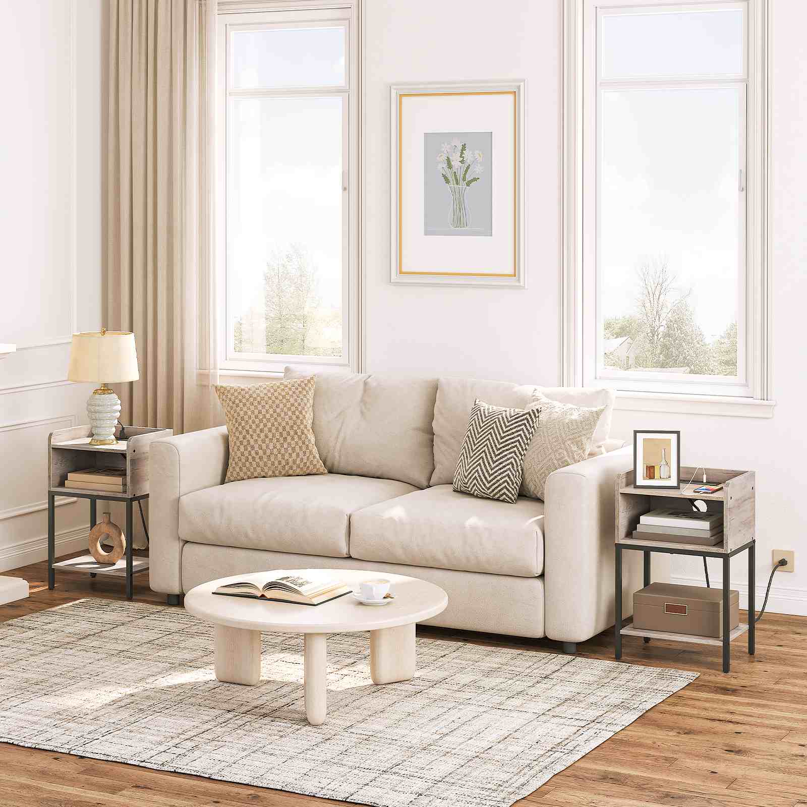 Integrert ladestasjon: This end table is equipped with a built-in charging station featuring 2 AC-uttak og 2 USB-porter, designed to meet the daily charging needs of electronic devices. The multi-port configuration enables simultaneous charging of mobile phones, tabletter, skrivebordslamper, laptops and other devices, enhancing daily convenience.