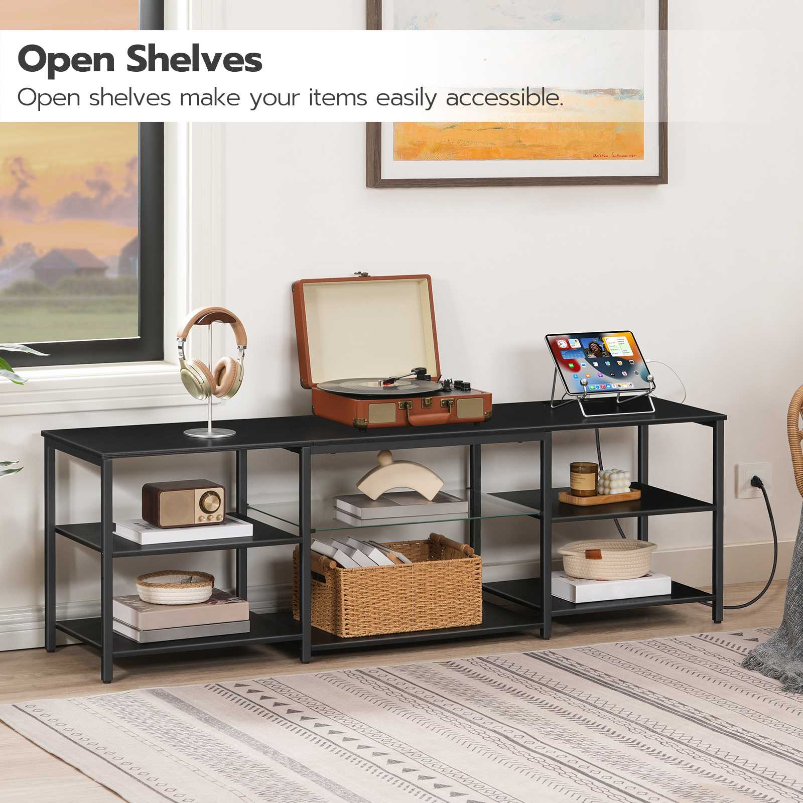Zintegrowany stojak pod telewizor LED do telewizorów 65 cali z wbudowaną stacją ładującą, 3-Centrum rozrywki dla graczy z otwartą pamięcią masową, Długi stół multimedialny do salonu i sypialni, Czarne wykończenie