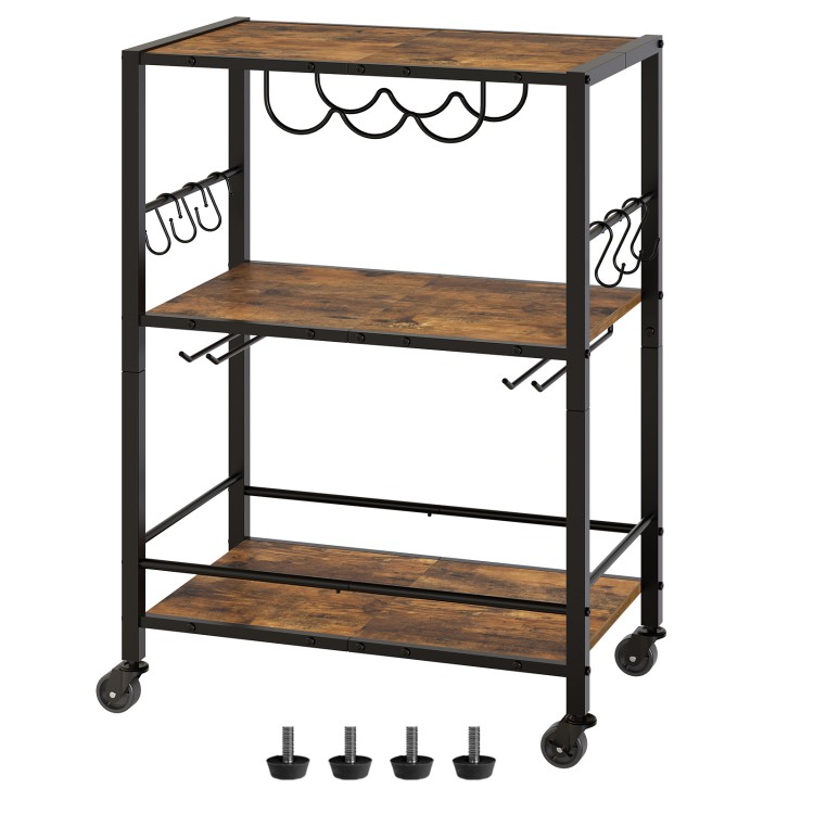 Wózek barowy, 3-Poziomowy wózek do serwowania, Wózek kuchenny ze stojakiem na wino, 22.4" Lx 12.9" szer.x 32.3" H, Wózek mikrofalowy z 6 Haczyki, Wózek na napoje do kuchni, Salon, Rustykalny brąz i czerń