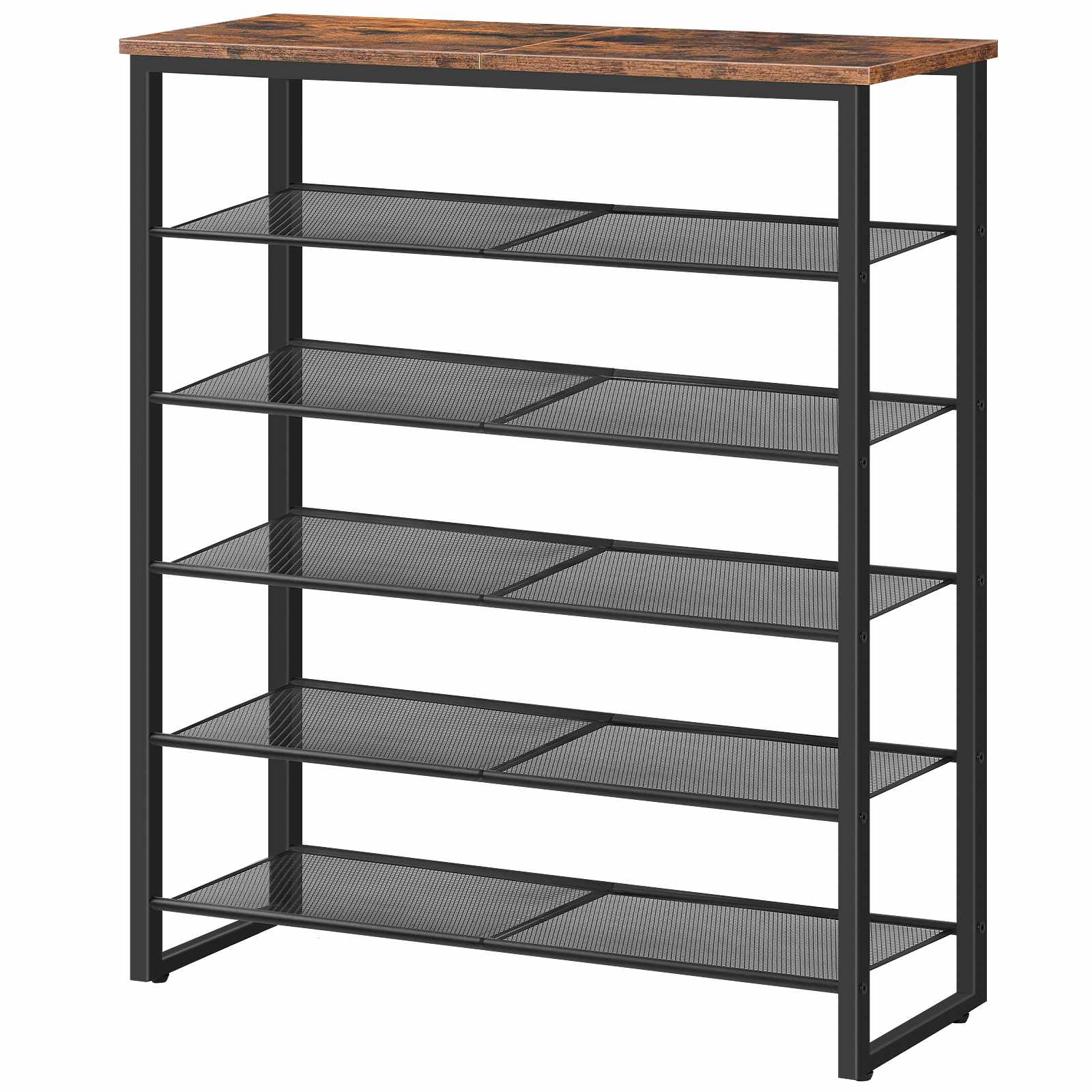 Solidna i trwała konstrukcja: The shoe rack is constructed from high-quality particleboard and a reinforced sturdy metal frame, ensuring excellent structural stability and long-term service life. The wooden top panel has a maximum load-bearing capacity of approximately 10kg, while each metal mesh shelf can safely support up to 5kg, providing reliable bearing performance for various types of footwear.