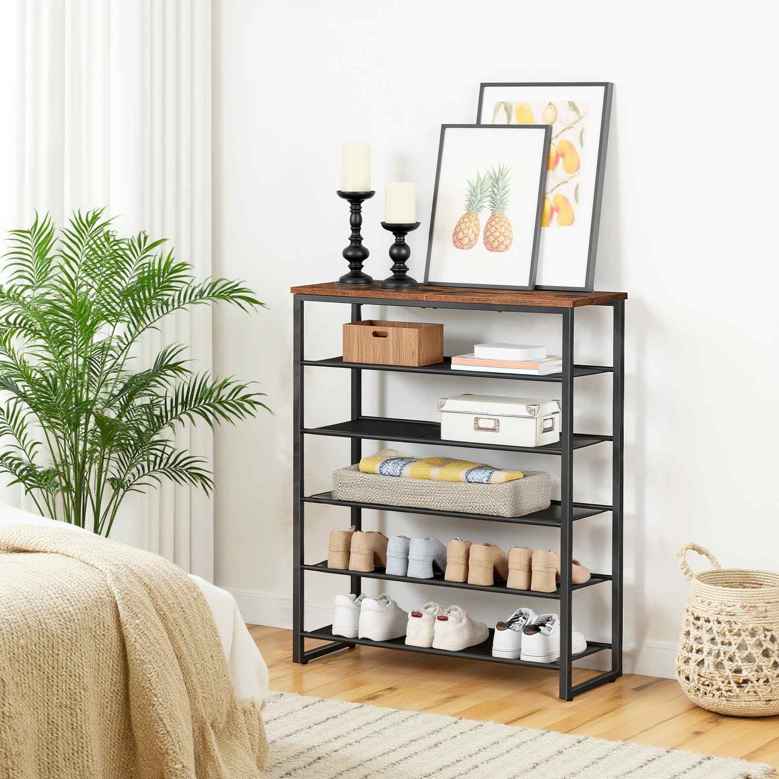 Stylish and Versatile Aesthetic Design: This shoe organizer integrates practical functionality with elegant appearance, featuring a matte black metal frame with a refined modern rustic brown finish. The classic industrial style design ensures seamless matching with various types of household furniture, enhancing the overall aesthetic coordination of the installed space.